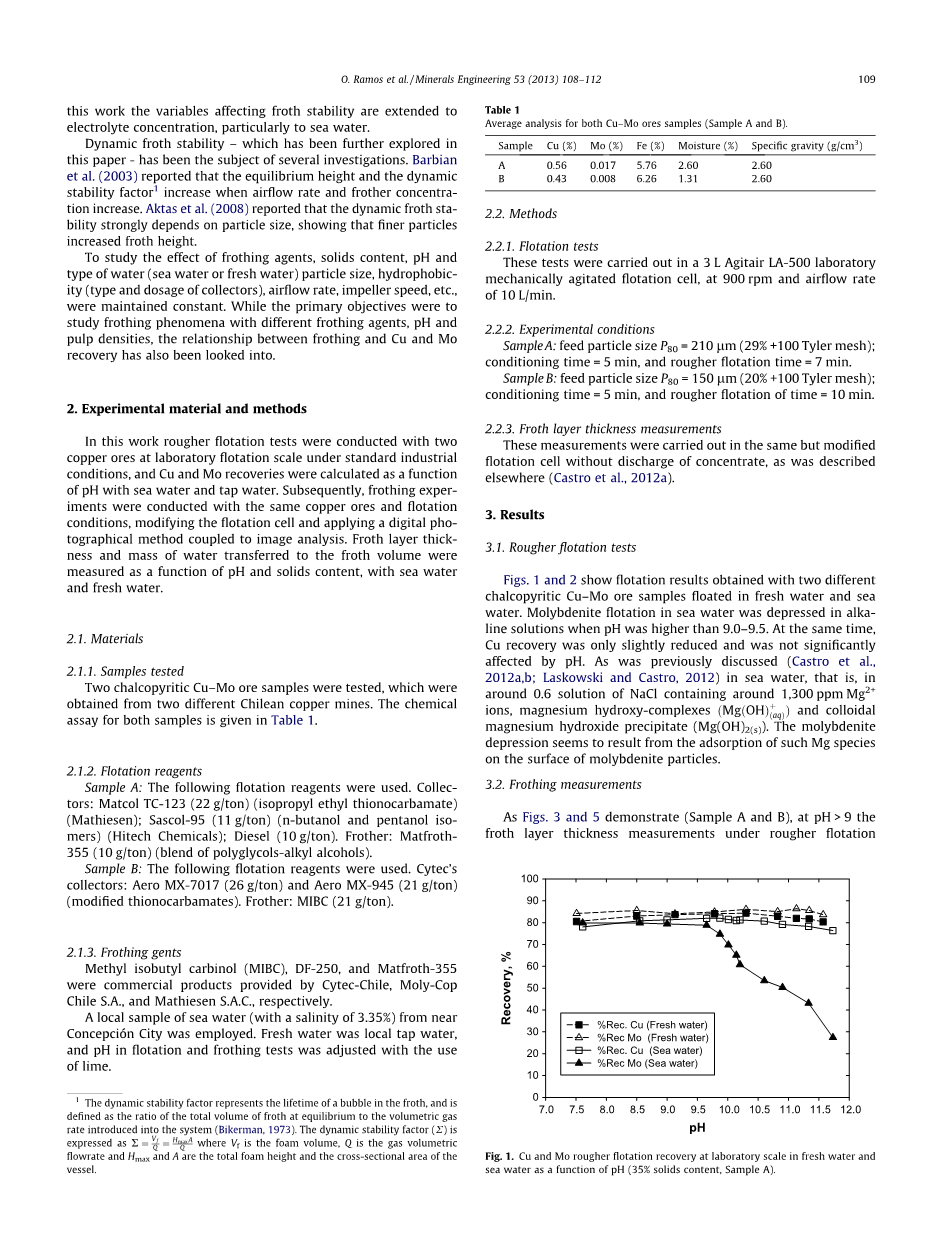 当Cu-Mo硫化物矿石漂浮在海水中时,Cu和Mo的回收率较低(Castro等,2012b)。海水中的盐的高含量似乎是主要的因素。浮选矿浆的起泡性也受无机电解质的存在的影响,这就提出了海水是否需要不同的浮选条件,或者是否需要选择起泡剂的新标准(Castro等,2012a)。在本文中,考虑了淡水和海水中铜和钼回收率以及较粗糙浮选中矿浆泡沫度的关系。