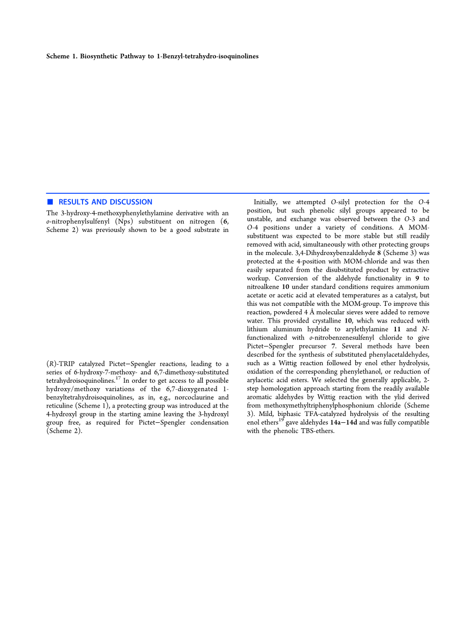 仔细优化Nps-取代的芳基乙胺和芳基醛之间的二醇磷酸催化的Pictet-Spengler反应已经产生了合成具有高ee的1-苄基四氢异喹啉的一般方法。该Nps-取代基保护氮原子