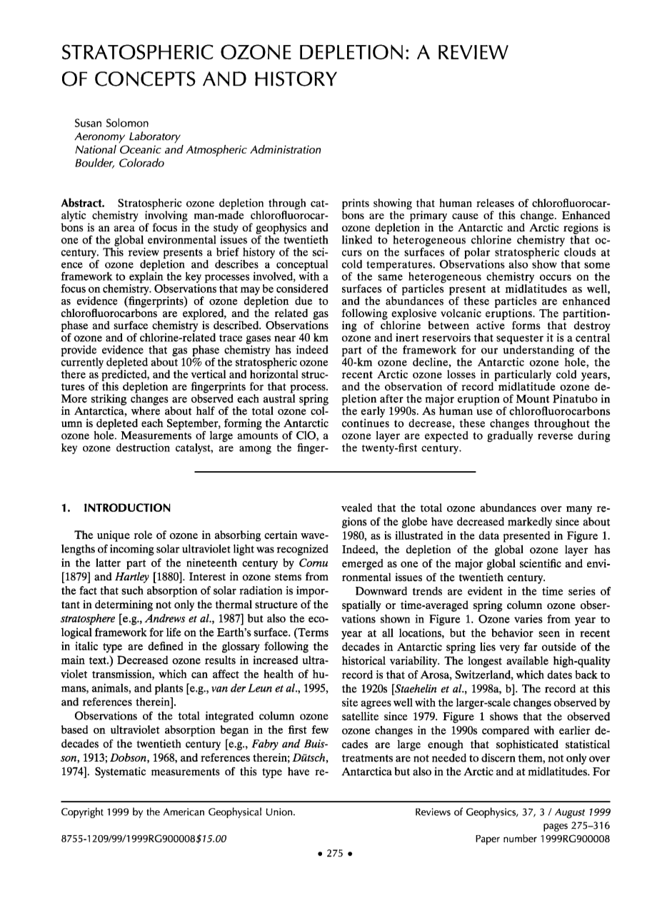 摘要:通过涉及人造氯氟烃的催化化学物质引起的平流层臭氧消耗是地球物理研究和二十世纪全球环境问题之一的重点领域。本综述介绍了臭氧消耗科学的简要历史,并描述了一个概念框架,用于解释所涉及的关键过程,重点是化学过程。探讨了可能被视为由氯氟烃引起的臭氧消耗的证据(指纹)的观察结果,并描述了相关的气相和表面化学。对臭氧和40公里附近的氯相关微量气体的观测结果表明,气相化学确实目前已经消耗了大约10%的平流层臭氧,正如预测的那样,这种耗尽的垂直和水平结构是该过程的指纹。南极洲南方的每个春季都观察到了更为显着的变化,每年9月,臭氧总量的一半左右被耗尽,形成了南极臭氧洞。大量氯氧化物(一种关键的臭氧破坏催化剂)的测量表明人体释放氯氟烃是导致这种变化的主要原因。南极和北极地区臭氧消耗的增加与非均相氯化学有关,这种化学反应在极冷的极地平流层云表面发生。观测还表明,一些相同的非均相化学也发生在中纬度的颗粒表面,并且在爆发性火山爆发后这些颗粒的丰度得到增强。在消除臭氧的活性形式和隔离它的惰性储层之间分配氯是我们理解40公里臭氧减少、南极臭氧洞形成、特别是寒冷年代北极臭氧损失最近的框架的核心部分,20世纪90年代初皮纳图博火山大爆发后观察到的中纬度臭氧消失。随着人类对氯氟烃的使用持续减少,预计整个臭氧层的这些变化将在二十一世纪逐渐逆转。