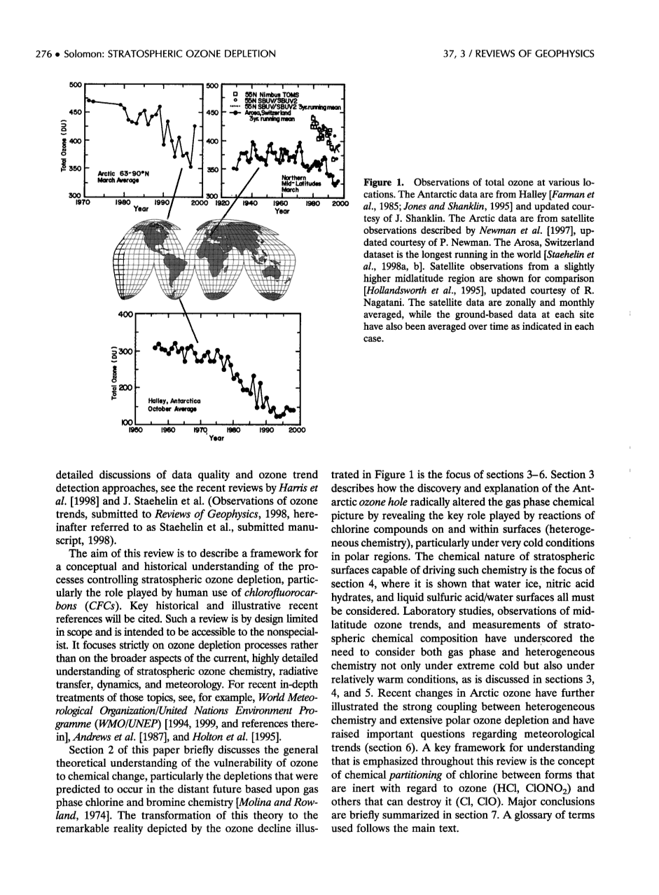 本文第2部分简要讨论了臭氧对化学变化的脆弱性的一般理论认识,特别是基于气相氯和溴化学预测在遥远的未来发生的枯竭。将这一理论转变为臭氧衰退所描绘的显著现实,图1中的特性是第3-6节的重点。第3节描述了南极臭氧洞的发现和解释如何通过揭示氯化合物在表面和表面内的反应(异质化学)发挥的关键作用,特别是在极地寒冷条件下,如何从根本上改变了气相化学图像。能够驱动这种化学反应的平流层表面的化学性质是第4部分的重点,其中表明必须考虑水冰,硝酸水合物和液态硫酸/水表面。实验室研究,中纬度臭氧趋势的观测以及地层球化学成分的测量强调了在极端寒冷条件下以及在相对温暖的条件下同时考虑气相和非均相化学的必要性,如第3、4、5节所述 。最近北极臭氧的变化进一步说明了异质化学与广泛的极地臭氧消耗之间的强烈耦合,并提出了有关气象趋势的重要问题(第6节)。在整个评论中强调的一个理解的关键框架是在对臭氧(HCl,ClON0 2)和其他可以破坏它(Cl,ClO)的惰性形式之间化学分配氯的概念。主要结论简要概述在第7节中。使用的术语表遵循正文。
