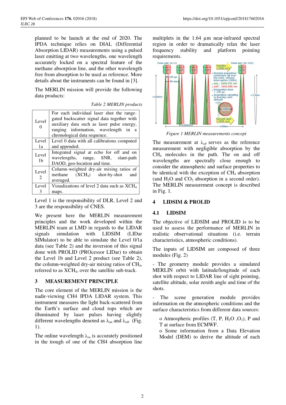 本文介绍了MERLIN测量原理和在LMD的MERLIN团队中开发的与LIDSIM(激光雷达模拟器)激光雷达信号模拟有关的工作,以便能够模拟0/1a级数据(见表2),并使用PROLID(激光雷达处理器)对该信号进行反演,以获得1b级和2级产品(见表2),即卫星子轨道上CH4(称为XCH4)的线柱加权干空气混合比。
