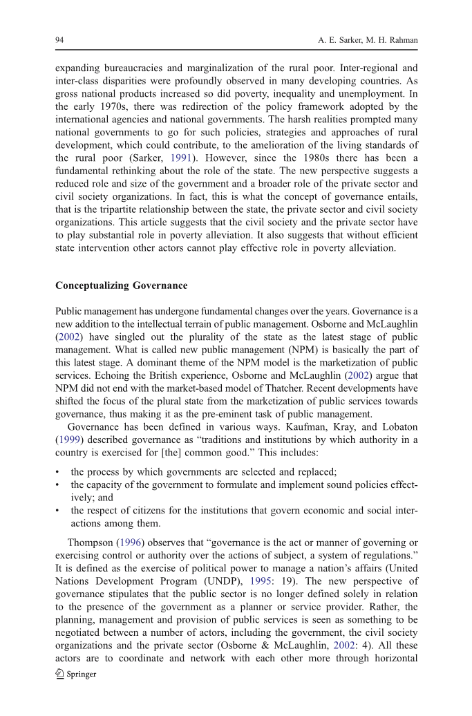 官僚机构的扩张和农村贫困人口的边缘化。许多发展中国家深刻地注意到区域间和阶级间的差距。随着国民生产总值的增长,贫困、不平等和失业也在增加。在1970年代初,国际机构和各国政府通过的政策框架发生了改变。严酷的现实促使许多国家政府采取农村发展的政策、战略和方法,这些政策、战略和方法可有助于改善农村穷人的生活水平(Sarker, 1991)。然而,自1980年代以来,人们对国家的作用进行了重新思考。新的观点建议减少政府的作用和规模,扩大私营部门和民间社会组织的作用。事实上,这就是治理理念所包含的内容,即国家、私营部门和民间社会组织之间的三方关系。这篇文章建议,民间社会和私营部门必须在减轻贫困方面发挥实质性的作用。它还表明,如果没有有效的国家干预,其他行动者就不能在减轻贫困方面发挥有效作用。