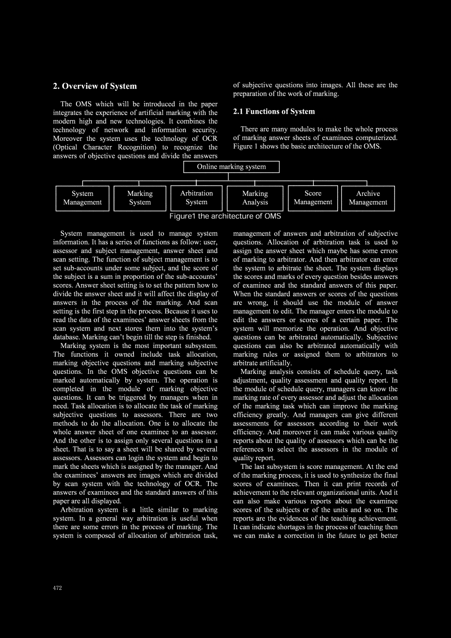 本文介绍的在线阅卷系统整合了人工阅卷的经验和现代高新技术,它结合了网络技术和信息安全,此外,该系统使用OCR技术(光学字符识别)去识别客观问题的答案,并将主观问题的答案分割成图像,这些都是阅卷的工作准备。