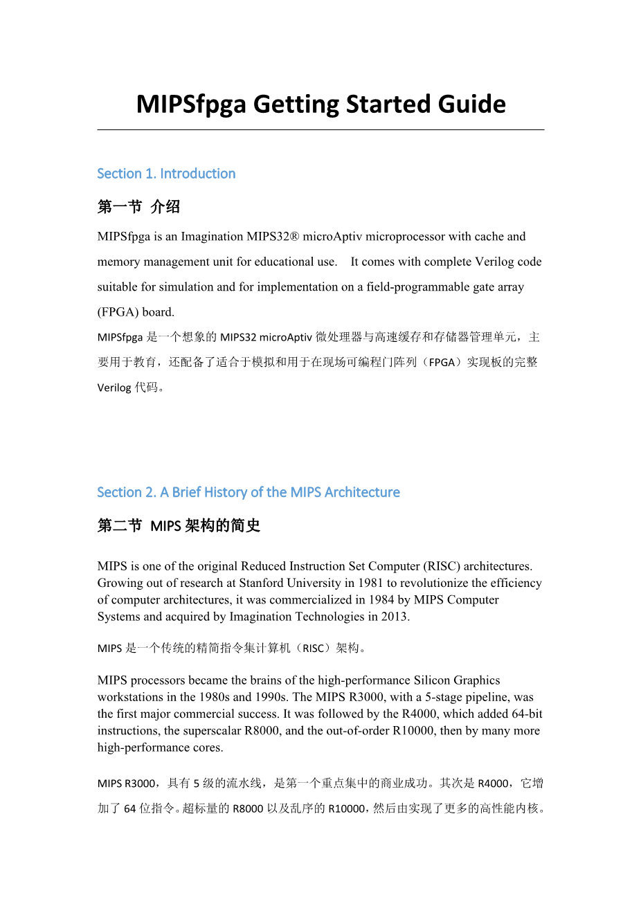 This guide begins with an overview of the MIPS core, called MIPSfpga, followed with detailed steps on how to simulate and run MIPSfpga on an FPGA. We also describe the MIPSfpga cores interface signals and how to write and run programs on the MIPSfpga core. The guide concludes with an overview of additional references that will aid in understanding the MIPSfpga core specifically and the MIPS architecture generally.