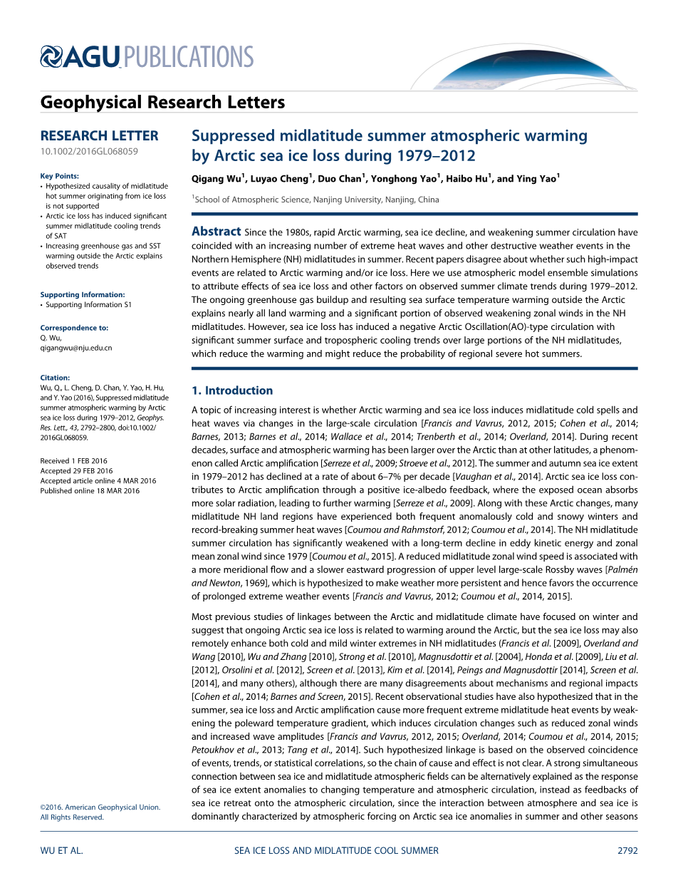 以前大多数关于北极与中纬度气候关联的研究都集中关注冬季,并且认为持续的北极海冰流逝是同北极周围地区的增暖相联系的,但是,海冰流逝可能也远程地同时增强了北半球中纬度地区冬季的极端冷,热事件(Francis et al. [2009], OverlandandWang[2010],WuandZhang[2010],Strongetal.[2010],Magnusdottiretal.[2004],Hondaetal.[2009],le et al[2012], Orsolini et al. [2012], Screen et al. [2013], Kim et al. [2014], Peings and Magnusdottir [2014], Screen et al. [2014], and many others),尽管对物理机制以及区域影响存在很多的争议[Cohen et al., 2014; Barnes and Screen, 2015]。最近的观测研究也指出,在夏季,海冰流逝以及北极放大现象通过减弱向极温度梯度导致了更加频繁的极端中纬度热浪事件,减弱的向极温度梯度也导致了诸如纬向风减弱和波动幅度增大这样的大气环流改变[Francis and Vavrus, 2012, 2015; Overland, 2014; Coumou et al., 2014, 2015; Petoukhov et al., 2013; Tang et al., 2014]。这种假设的相关性是建立在的事件,趋势或统计相关性的观测一致性上的,因而其中因与果之间的联系并不明确。海冰和中纬度大气场之间强烈的同时相关性也可以被解释为由海冰范围异常导致改变温度场和大气环流的结果,而不是将海冰消退作为对大气环流的反馈,虽然大气与海冰之间的相互作用主要表现为在夏季和其他季节大气对北极海冰异常的强迫[Wu and Zhang,2010]。在北半球中纬度大范围的地区观测到的夏季平均地表温度(SAT)和春季四-五双月的平均海冰指数之间的滞后关系显示出对于早季北极海冰流逝的显著的降温响应(在支撑材料中的图 S1 )。北极海冰流逝远程地导致了中纬度地区夏季更加频繁剧烈的极端热事件这一假说并没有被模式研究所证实,因而时常收到批评[Barnes, 2013; Barnes et al., 2014; Wallace et al., 2014; Trenberth et al., 2014]。在其他的观测研究中这样的联系也并不强烈[Barnes, 2013; Barnes et al., 2014],并且随机的大气内部变率有可能掩盖掉海冰改变和中纬度天气事件之间的可能联系[Barnes, 2013; Screen et al., 2014]。例如,最近的气候异常,像是中纬度地区的炎热夏季可能仅仅是由于自然的大尺度大气环流变化所引起的[Wallace et al., 2014]。Trenberth等[2014]认为,北极对中纬度的大气环流影响很小,因为北极的降水改变所导致的潜热通量异常比热带地区典型的变化所导致的要小得多。由于争议不断,本研究分析了涵盖1979-2012年的大量模拟的集合数据,以期检测出观测到的北极海冰减少对中纬度地区夏季可能产生的影响。