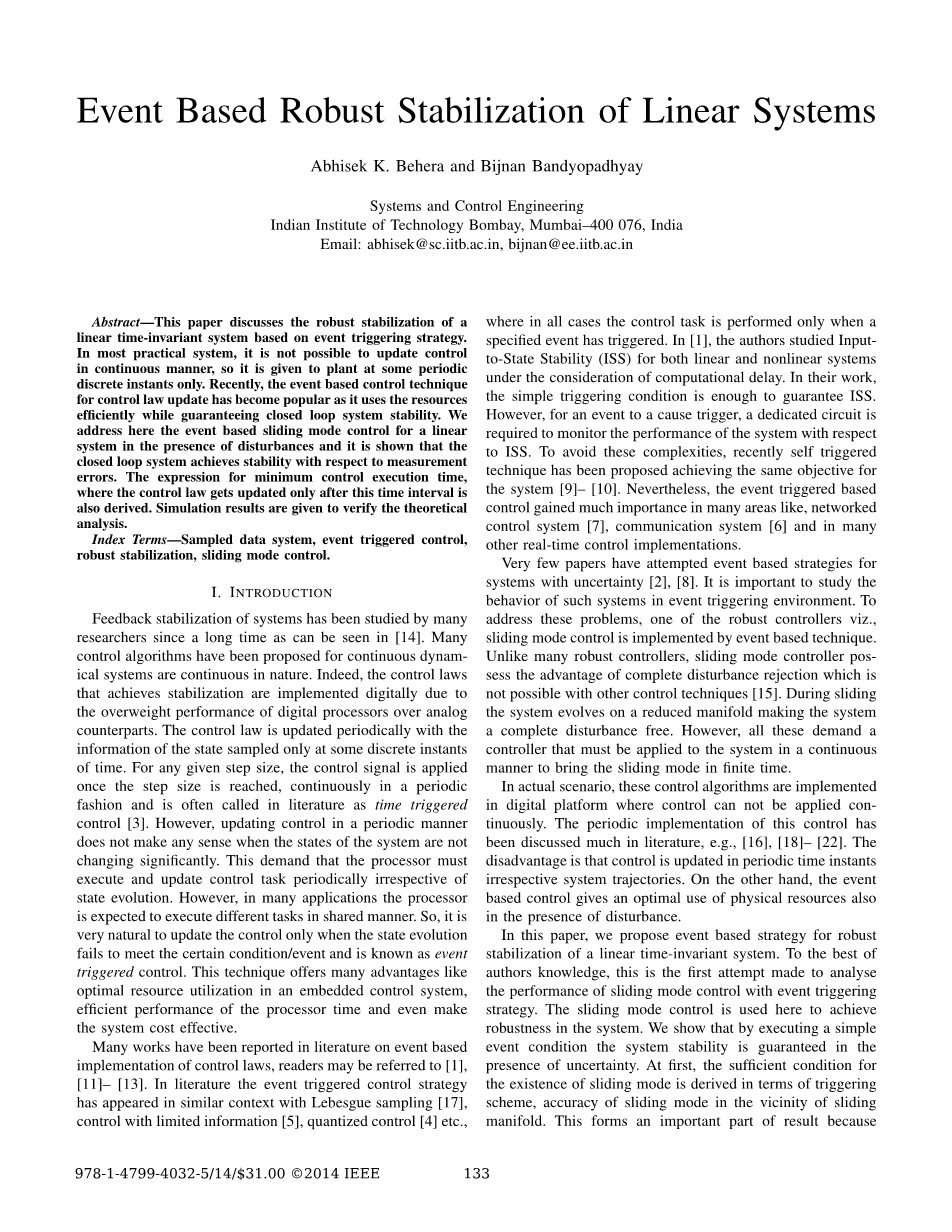 在本文中,我们解决了通过滑模控制实现关于测量误差e(t)的鲁棒稳定的问题。我们通过执行使系统稳定的简单事件来确保这一点。在本文中,我们表明没有Zeno现象,即在一些有限执行时间[ti,ti 1[内,没有控制累积。