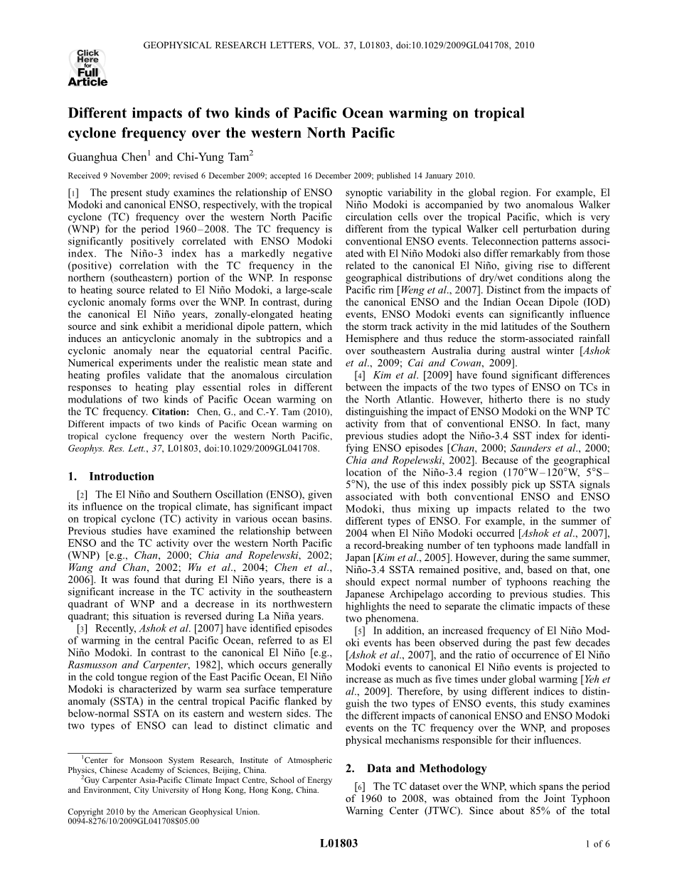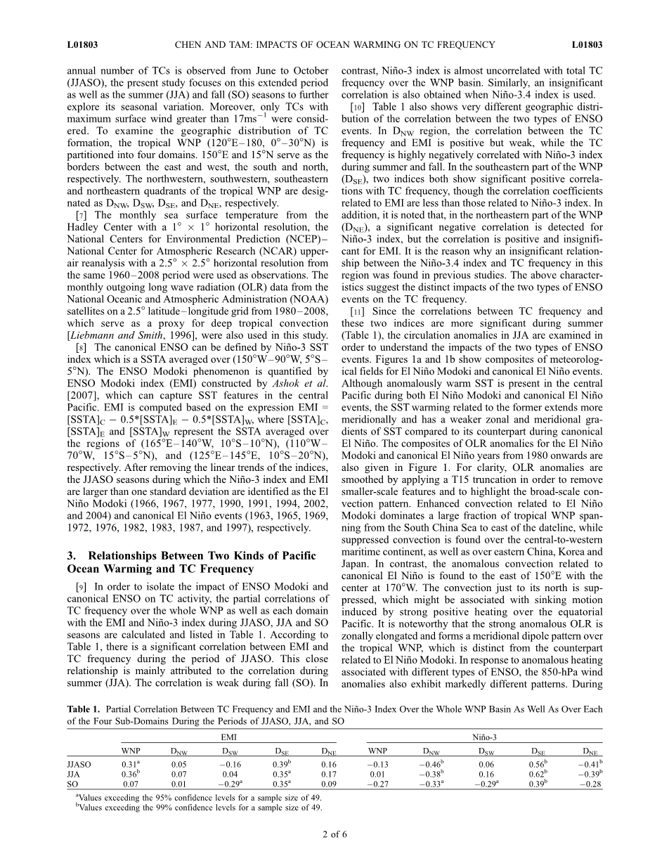 鉴于厄尔尼诺和南方涛动(ENSO)对热带气候的影响,其对各种海盆的热带气旋(TC)活动产生了重大影响。以前的研究已经考察了ENSO与北太平洋西部(WNP)TC活动之间的关系[例如,Chan,2000;Chia和Ropelewski,2002年;Wang和Chen,2002;Wu等,2004;Chen等,2006]。结果发现,在厄尔尼诺年间,WNP东南象限的TC活动显著增加,西北象限TC活动减少;在拉尼娜年间,这种情况发生了逆转。