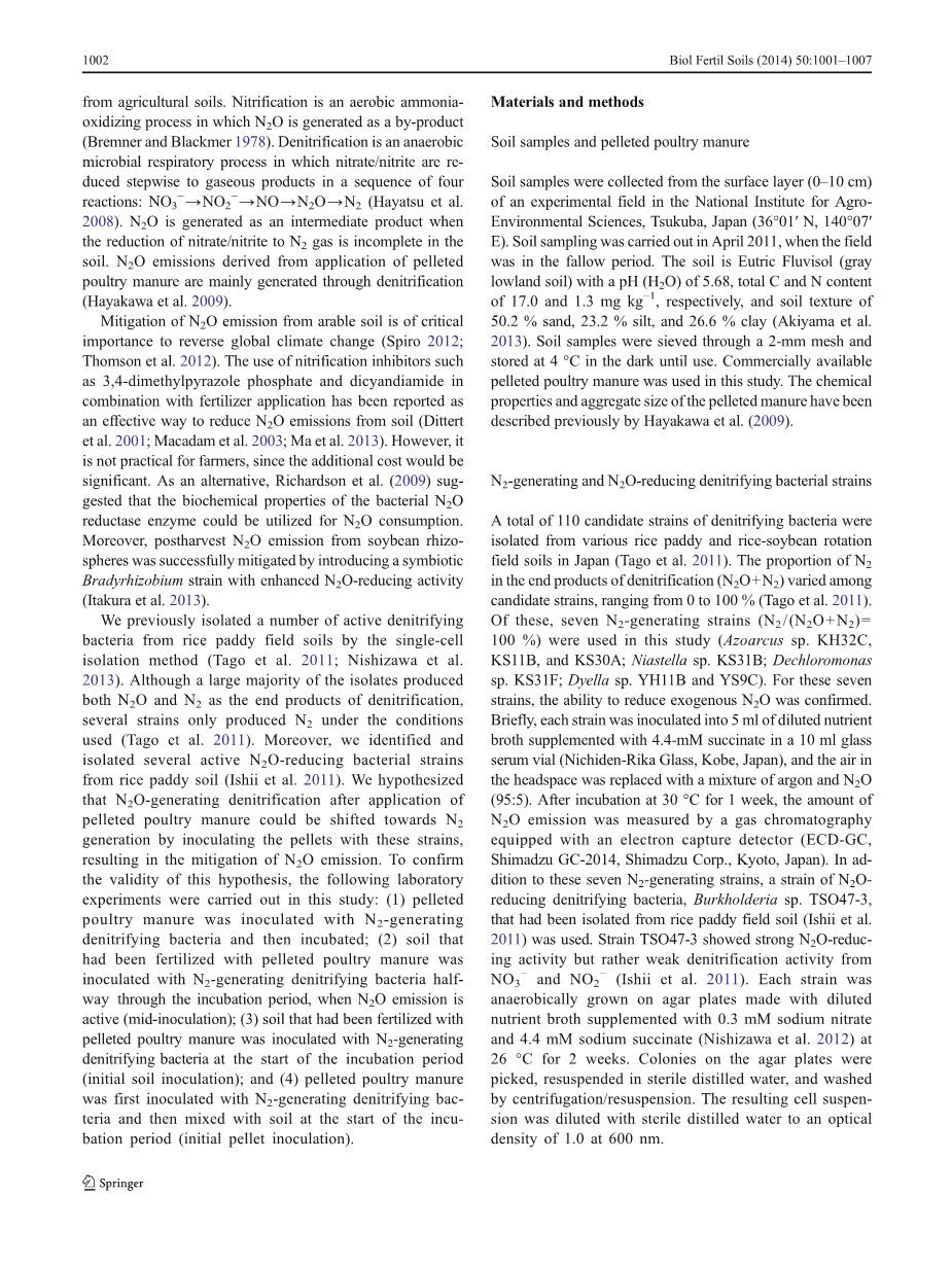 (Tago等人。2011).此外,我们从稻田土壤中鉴定并分离了几种活性N2O-还原菌株(Ishii等。2011).我们假设施用沉淀的家禽粪便后N2O-产生的反硝化作用可以通过用这些菌株接种颗粒而转向N2 产生,从而减轻N2O 的排放。为了证实该假设的有效性,在该研究中进行了以下实验室实验:(1)将沉淀的家禽粪接种N2生成的反硝化细菌,然后培养;(2)当N2O排放活跃(接种中期)时,在沉淀期间,用颗粒状家禽粪肥施肥的土壤接种N2生成的反硝化细菌;(3)在培养期开始时(初始土壤接种),用颗粒状家禽粪肥施肥的土壤接种N2生成的反硝化细菌;(4)颗粒状家禽粪便首先接种N2生成的反硝化细菌,然后在培养开始时与土壤混合(初始颗粒接种)。