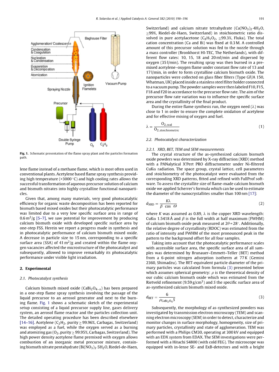 来自家庭和工业活动的有毒有机污染物造成环境问题。因此,利用光催化材料进行环境修复成为一个迫切需要解决的问题。然而,选择合适的系统仅限于半导体氧化物,这是光化学稳定,能够有效吸收可见光。另外一个影响所涉及体系光催化效率的关键因素是能带的适当位置。例如,虽然芳香烃中的碳在不同的光催化剂上氧化成CO2相对容易,但导致有机污染物完全矿化的完全去芳构化过程通常过于缓慢,如果不是不可能的话。在这方面,邹等人对In1minus;xNixTaO4 (x = 0-0.2)的开创性研究,为探索其他用于光催化目的的二元或三元氧化物提供了重要的动力。人们对混合半导体氧化物材料的兴趣主要来自于它们的价电子带的上移,而价电子带的上移被分配到O 2p轨道和过渡金属轨道之间的杂化,如Bi(6s)、Ag(4d)、Ta(5d)和V(3d)。因此,杂化价带使得合成光催化剂的带隙减小。基于这一经验规律,许多有前途的材料被精心设计,以消除潜在的性能损失路径,然后迅速实施环境修复[3-9]。值得一提的是,最近报道的Ag基固溶钙钛矿(Ag0.75Sr0.25)(Nb0.75Ti0.25)O3[10]对乙醛的分解具有良好的光催化效率。然而,由于对纳米材料的需求,重要的是合成的光催化剂不需要任何可能导致颗粒生长和粗化的额外热处理。目前,这是上述用于环境修复的材料的一个本质缺陷。在这方面,我们的方法是通过一步火焰喷雾合成来减少与颗粒大小、结晶度和低表面积有关的复合问题。这种自底向上的合成方法可以生产多种材料,包括金属氧化物、混合金属氧化物、硫化物、氮化物和金属合金,与溶液粉末制备或固态反应等自顶向下的方法相比,它有一些优势[11-13]。我们的装置的一个特别的优点是使用燃烧焓高的乙炔火焰代替传统装置中最常用的乙烷火焰。乙炔基火焰喷雾合成提供了高温(gt;3000◦C)和高冷却速度,使成功的转化水前驱体溶液的钙和硝酸铋到高晶体功能纳米颗粒。