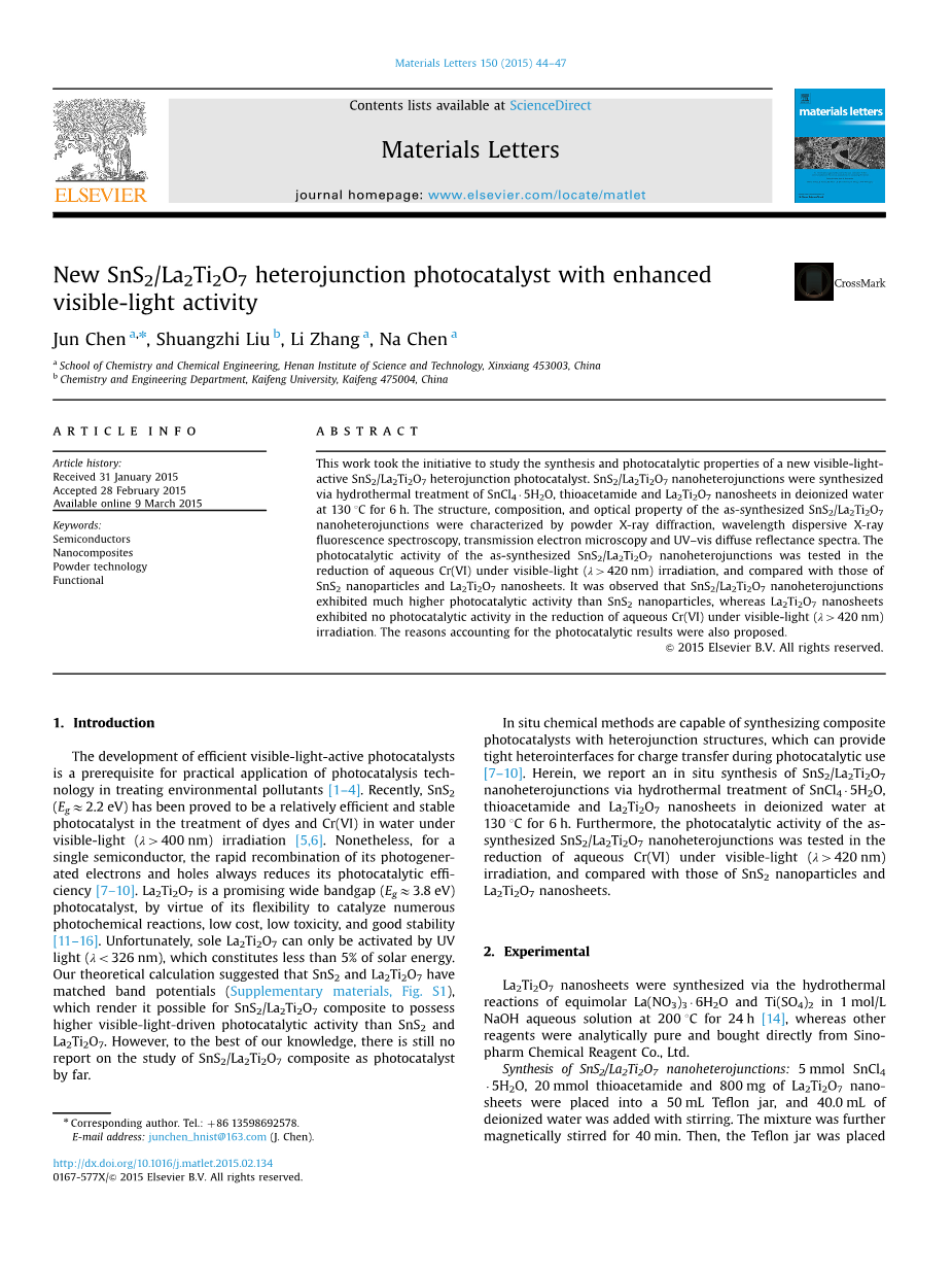 其光催化效率[7-10]。La2Ti2O7具有催化多种光化学反应的灵活性,成本低,毒性小,稳定性好,是一种很有前景的宽带隙(Egasymp;3.8 eV)光催化剂[11-16]。不幸的是,只有紫外光(lambda;<326 nm)才能激活La2Ti2O7,它占太阳能的比例不到5%。我们的理论计算表明,SnS2和La2Ti2O7具有匹配的带电位(补充材料,图S1),这使得SnS2/La2Ti2O7复合材料具有比SnS2和La2Ti2O7更高的可见光驱动的光催化活性。然而,据我们所知,目前还没有关于SnS2/La2Ti2O7复合材料作为光催化剂的研究报道。