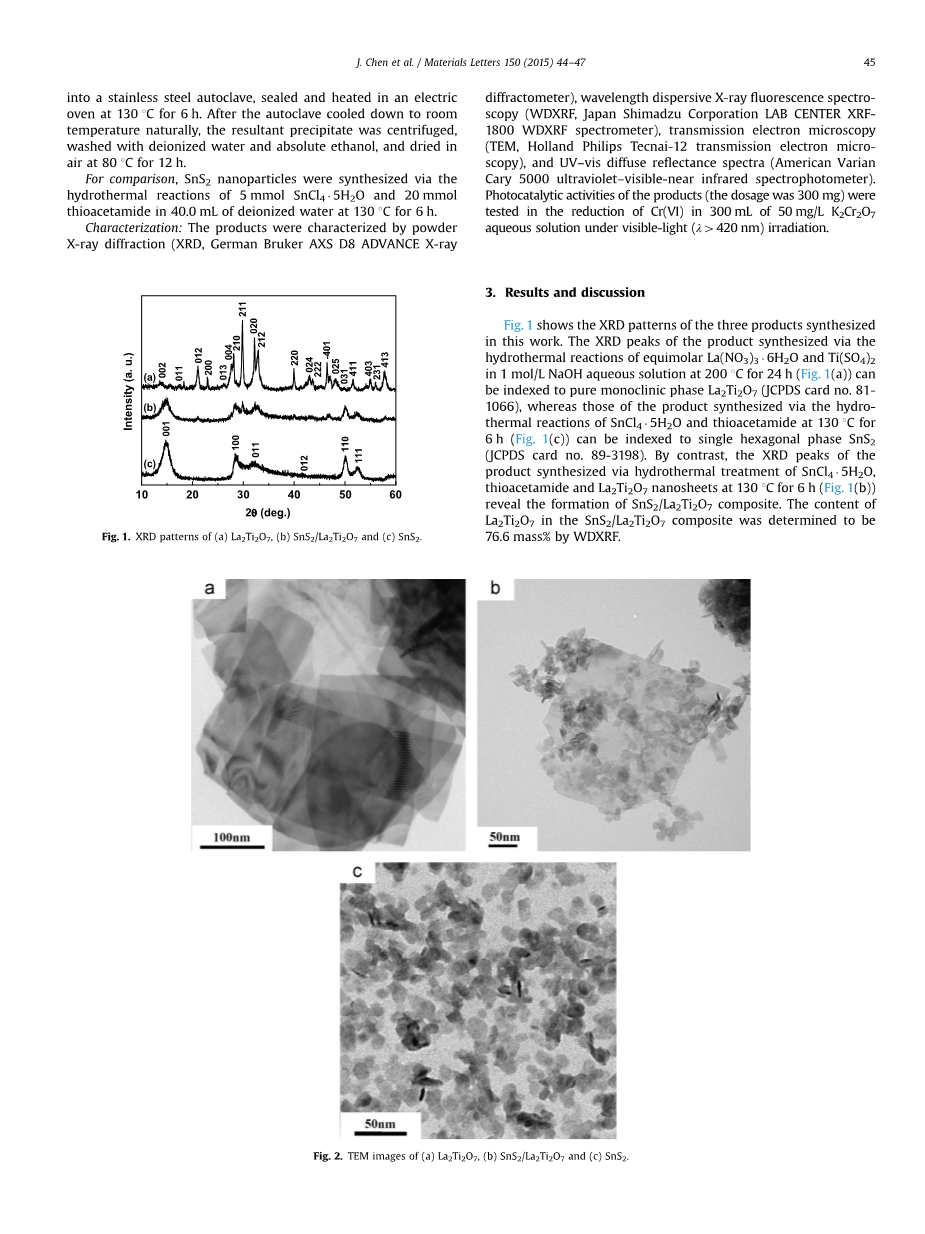 原位化学方法能够合成具有异质结结构的复合光催化剂,为光催化过程中的电荷转移提供紧密的异质界面[7-10]。在此,我们报道了一种原位合成SnS2/La2Ti2O7纳米异质结的方法,该方法是在去离子水中对SnCl4·5H2O、硫代乙酰胺和La2Ti2O7纳米片进行水热处理,温度为130℃,时间为6小时。此外,我们还测试了合成的SnS2/La2Ti2O7纳米异质结在可见光(lambda;>420 nm)照射下还原水中Cr(VI)的光催化活性,并与SnS2纳米颗粒和La2Ti2O7纳米薄片的光催化活性进行了比较。
