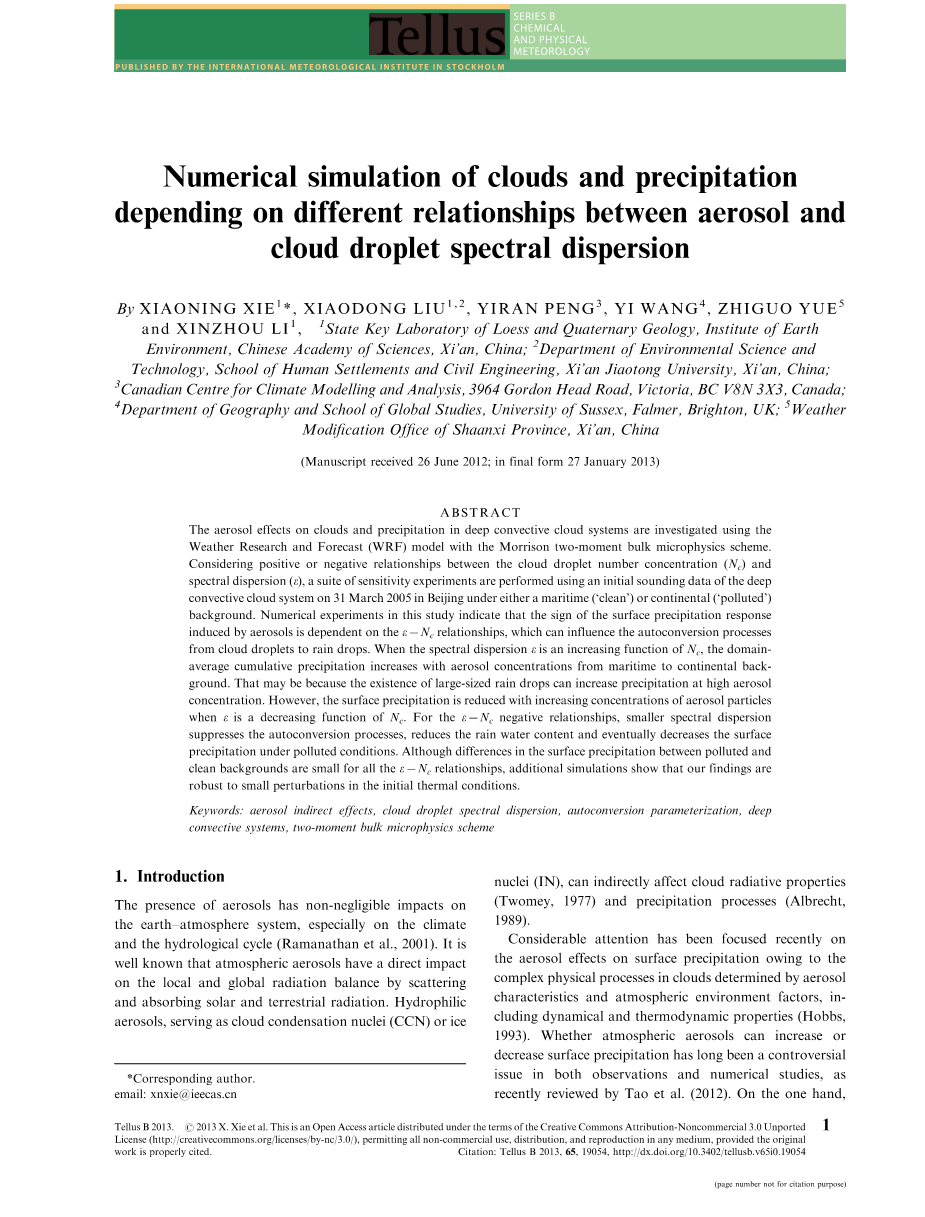 由于气溶胶特性和大气环境因素,包括气溶胶的动力学和热力学性质,决定了云中复杂的物理过程,气溶胶对地表降水的影响最近受到了相当大的关注(霍布斯,1993)。大气气溶胶是否能增加或减少地表降水一直是观测和数值研究中一个有争议的问题,Tao等人(2012)最近对此进行了综述。一方面,观测表明,城市和工业大气污染产生的气溶胶可以减小云滴大小,抑制云滴凝聚,进而减少降水(Rosenfeld, 1999)。另一方面,Shepherd和Burian(2003)声称在污染严重的城市地区周围观测到降水增强。许多先前的数值研究已经报道,来自空气污染的气溶胶可以抑制降水(Khain和Pokrovsky, 2004;Khain等,2004;崔等,2006;泰勒和莱文,2006年;范登希弗和科顿,2007;Storer等,2010;Tao等,2012)和增雨(Khain等,2005;王,2005;陶等,2012)。