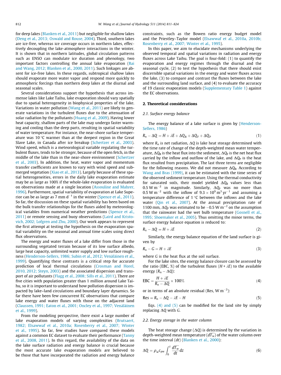 这项研究涉及太湖的辐射,能量和水汽通量,太湖是一个大型(2400平方公里)和浅(平均深度1.9米)的淡水湖。地表辐射和能量交换过程是湖泊蒸发和相关水文循环的重要驱动因素(Stephens等,2012; Verburg和Antenucci,2010)。 我们的实验数据是通过涡度相关法(EC)网络获得的,该网络由湖中的三个地点和陆地上的一个地点组成。自20世纪90年代以来,EC技术已被广泛用于测量许多高地生态系统中的热量,水蒸汽和动量通量(例如,Aubinet等,2000; Baldocchi等,2001)。虽然后勤上很困难,但近年来该技术也被用于越来越多的湖 - 空相互作用的长期野外活动中。(Blanken等,2003,2011; Liu等,2012a; Nordbo等,2011;Rouse等,2008)。在确定湖泊蒸发时,EC提供了更准确的水平衡方法替代方法,因为水平衡方法可能存在很大的不确定性(特别是对于大型湖泊),因为难以测量流入和流出量以及测量湖面上的降水量。迄今为止,大多数公布的EC观测都是在深海湖泊中进行的。在南半球更多的浅湖中,全年的EC观测仍然很少(Liu et al,2012)。