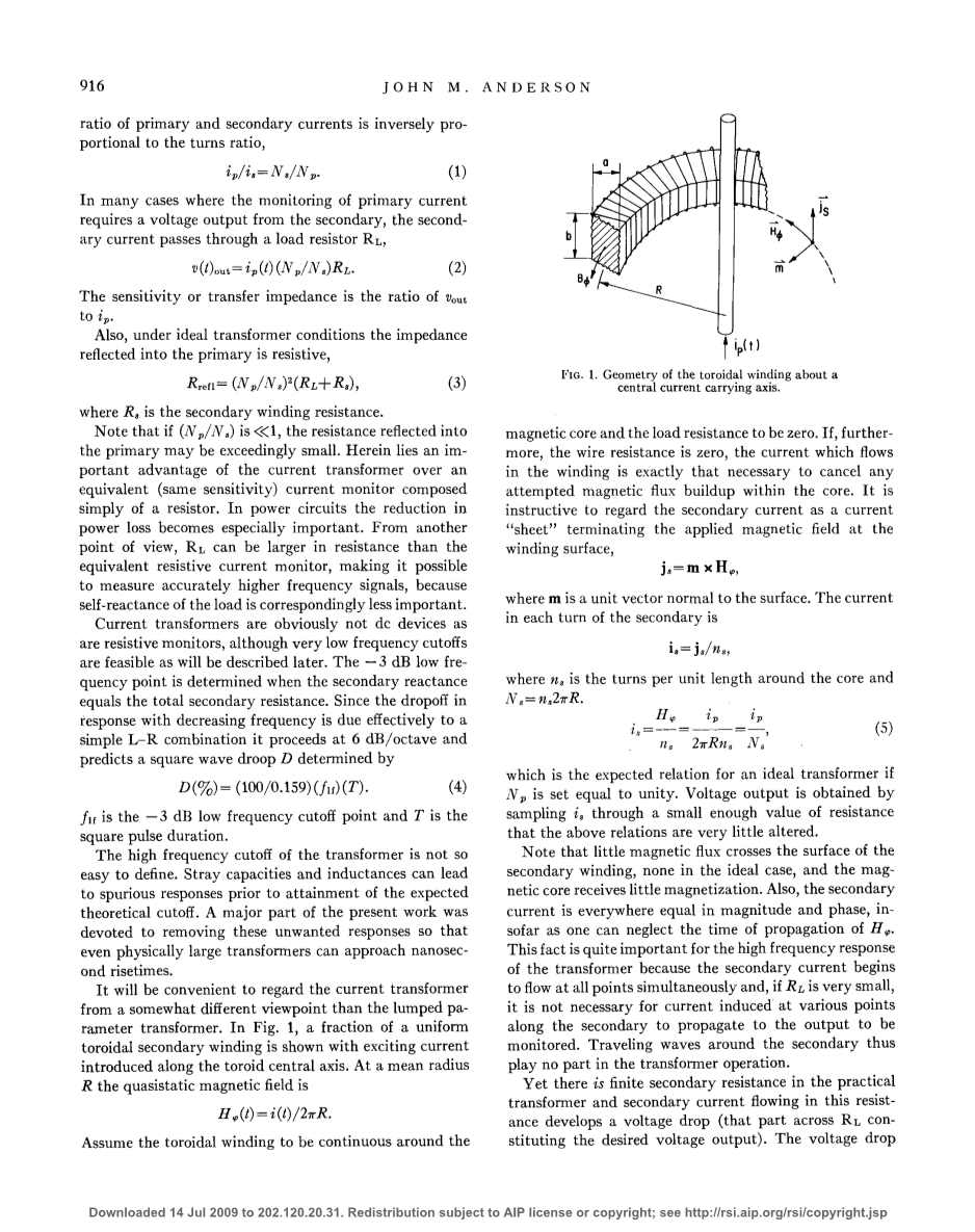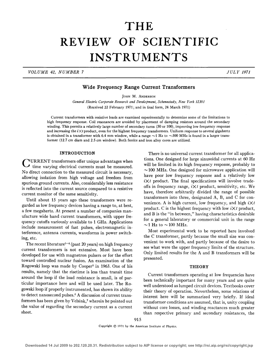 通过实验检查具有电阻性负载的电流互感器以确定高频响应的一些限制。通过在次级绕组周围放置阻尼电阻来避免线圈谐振,其允许相对大量的次级匝数(50或100),改善低频响应并增加itimes;t产品,即使对于最高频率的变压器也是如此。在具有6.4mm窗口的变压器中获得对几千兆赫兹的均匀响应,而在较大的变压器(直径12.7cm和2.5cm窗口)中发现1Hz~300MHz的范围,使用铁氧体和铁合金芯。