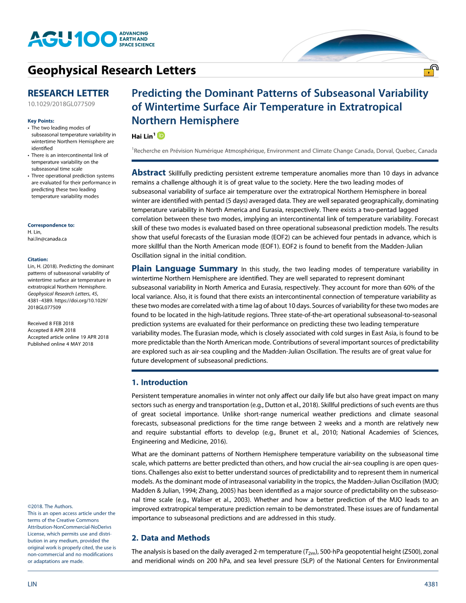 冬季持续的温度异常不仅影响我们的日常生活,而且对能源和交通等许多领域产生巨大影响(例如,Dutton等,2018)。因此,对此类事件的巧妙预测具有重要的社会意义。与短期数值天气预报和气候季节预报不同,2周至一个月的时间范围的季节性预测相对较新,需要大量努力才能发展(例如,Brunet等,2010;国家科学院,工程和医学,2016)。