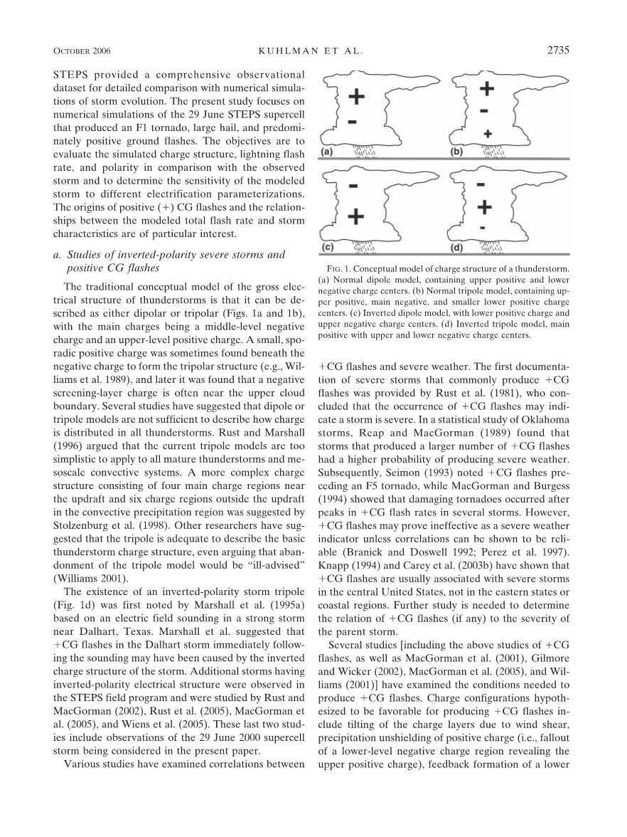 传统概念上的粗略的雷暴电结构模型可以说成是偶极性的结构或者是三极性的结构(图中1a和1b),主要的电荷区是中层负电荷区和它的上层正电荷区。小的、零星的正电荷有时常被发现在负电荷区下面形成了三极性结构,随后负极性屏蔽层电荷区被发现在靠近上层电荷区边缘的地方。一些研究已经表明了偶极性或者三极性模型不能充分的去描述电荷是如何在所有的雷暴云中的分布的。Rust和Marshall(1996)认为,目前的三极性模型过于简单,不能适用于所有成熟的雷暴和中尺度对流系统。Stolzenburg et al.(1998)提出了一种更为复杂的电荷结构,由对流降水区靠近上升气流的四个主要电荷区和上升气流之外的六个电荷区组成。其他研究人员认为三极子足以描述雷暴的基本电荷结构,甚至认为放弃三极子模型是“不明智的”(Williams 2001)。