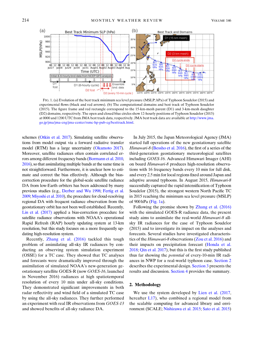 2015年7月,日本气象厅(JMA)开始全面运行新的地球同步卫星葵花八号(Bessho等人,2016年),这是包括GOES-16在内的第三代地球静止气象卫星系列中的第一颗。葵花八号上的高级Himawari成像仪(AHI)产生高分辨率观测,每10分钟有16个频段用于全盘,每2.5分钟用于固定在日本周围的局部区域并适应台风周围。2015年8月,Himawari-8成功捕获了台风Soudelor(2015)的快速增强,这是2015年最强的西太平洋TC,达到900 hPa的最低海平面气压(MSLP)(图1a))。