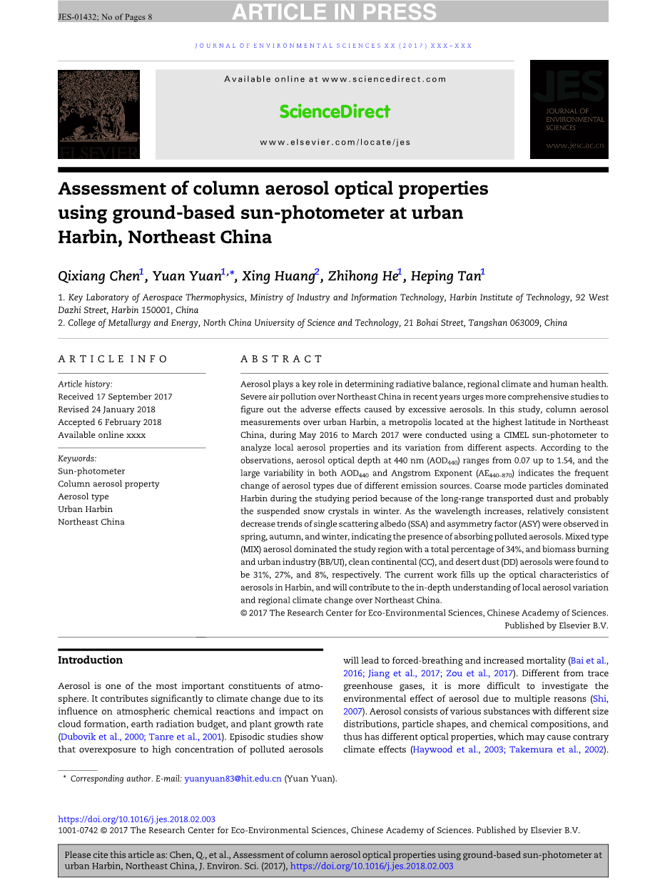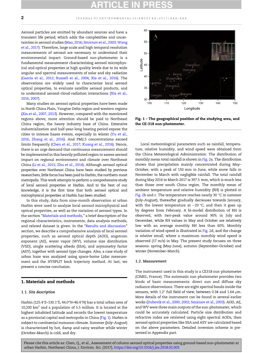 在华北平原,长江三角洲地区和西部地区进行了许多关于气溶胶光学特性的研究(Xia et al。,2007,2013).但是,与上述地区相比,中国重工业基地东北地区应该得到更多关注,广泛的工业化以及长达半年的加热期,使得该城市长期被笼罩于雾霾天气之下,尤其在冬季 (Yu et al.,2016; Zhang et al., 2016),并且pm2.5的值经常超过限定值(陈等人,2017;Kuang et al。,2016)因此,迫切需要在这个污染严重的地区实施连续测量,以评估气溶胶对中国东北地区环境和气候的影响(Li et al。,2015;朱等人,2014).虽然以前的研究人员已经研究过中国东北地区的气溶胶光学特性,但是对于最北部的大都市哈尔滨来说,很少关注它。这项工作试图对哈尔滨当地的气溶胶特性进行全面研究。据我们所知,这是哈尔滨首次研究气溶胶光学和微物理特性。