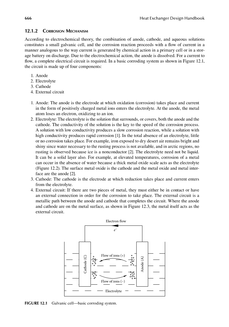 根据电化学理论,正极、负极、水溶液的结合组成一个小的原电池。腐蚀反应伴随着电的流动,小型的原电池和正在充电的蓄电池有着类似的化学反应。由于电化学的反应,正极溶解。电子流动形成电流,需要一个完整的电路。在一个完整的腐蚀系统如图12.1。电路由四部分组成。