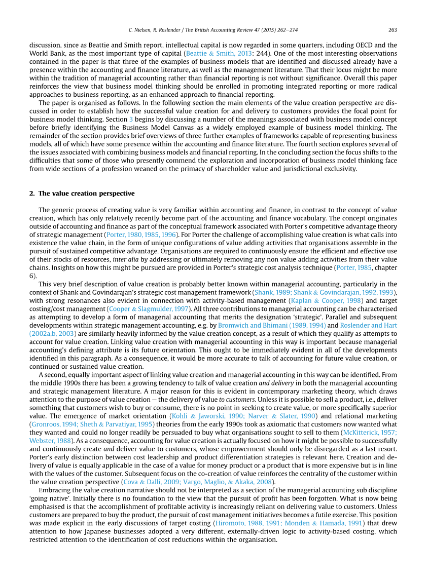 这种对价值创造的简短的描述也许在管理会计中更为人所知,特别是在Shank和Govindarajan的战略成本管理框架(Shank, 1989, Shank和Govindarajan, 1992, Shank和Govindarajan, 1993)中,在基于活动的管理(Kaplan amp; Cooper, 1998)和目标成本/成本管理(Cooper amp; Slagmulder, 1997)中也有明显的共鸣。对管理会计的所有三种贡献都可以被描述成在尝试形成一种管理会计形式,这种形式值得称之为“战略性”。并行和随后的发展战略管理会计,例如Bromwich和Bhimani(1989),Bromwich和Bhimani(1994),Roslender和Hart(2002a),Roslender和Hart(2002b),Roslender和Hart(2003)同样深受价值创造概念的影响,因此他们有资格作为尝试考虑价值创造。以这种方式将价值创造与管理会计联系起来是很重要的,因为管理会计的定义属性是其未来的方向。这一点可在本段所确定的所有事态发展中立即得到体现。因此,谈论未来价值创造的会计或持续或持续的价值创造会更准确。
