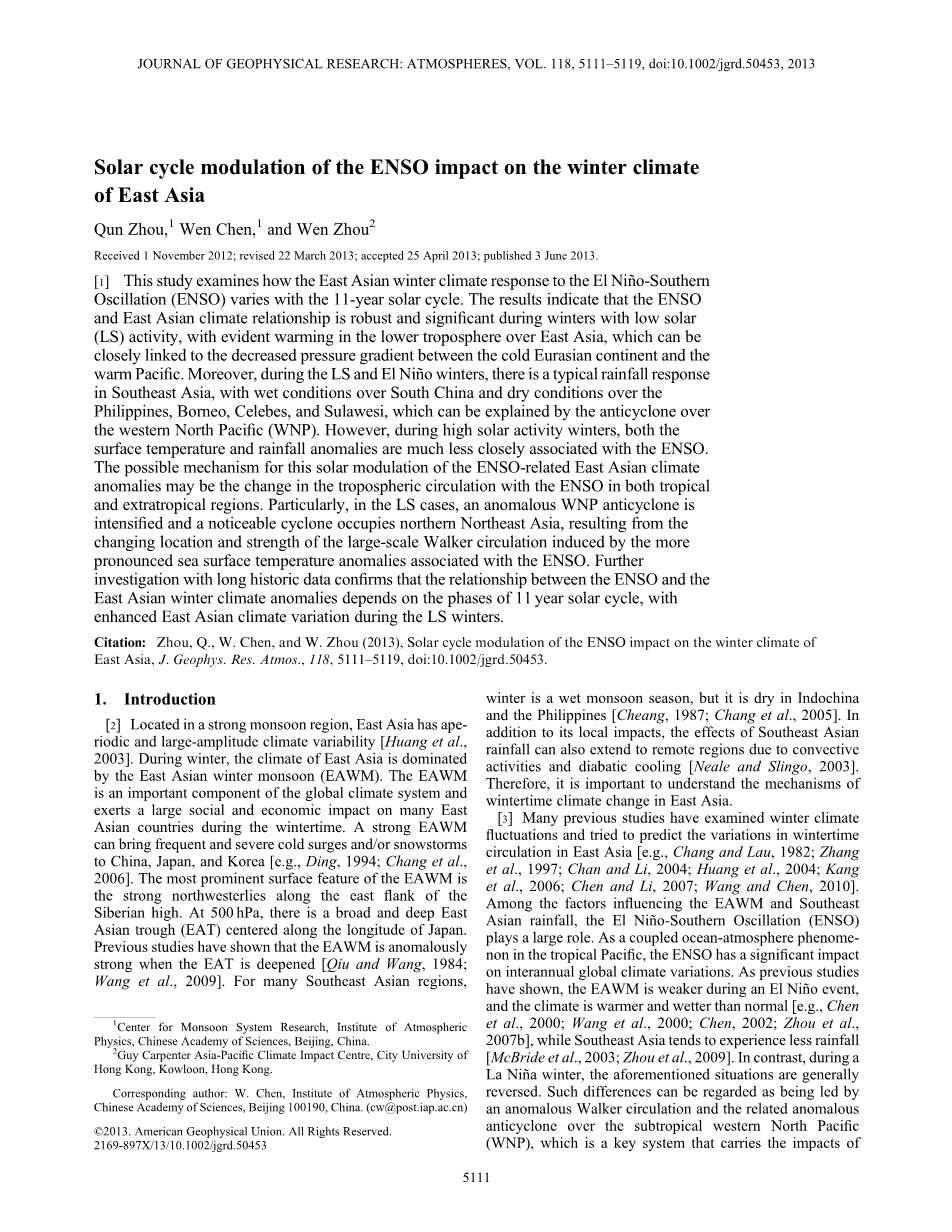 Citation: Zhou, Q., W. Chen, and W. Zhou (2013), Solar cycle modulation of the ENSO impact on the winter climate of East Asia, J. Geophys. Res. Atmos., 118, 5111–5119, doi:10.1002/jgrd.50453.