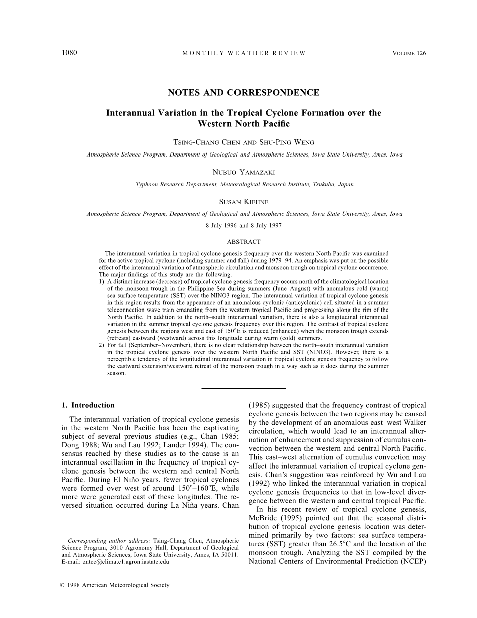 热带气旋在西北太平洋生成的年际变化在之前的研究中成了一个热门的话题(例如:Chan 1985;Dong 1988; Wu 和Lau 1992; Lander 1994)。造成西北太平洋热带气旋生成频率的年际涛动在先前的研究中已经达成了共识。厄尔尼诺年,在东经150-160°以西之间的热带气旋生成频数减少,在东经150°-160°以东生成的频数增加,而在拉尼娜年是相反的。 Chan(1985)提出,在这两个区域之间热带气旋生成的频率有可能是由于东西方向沃克环流的异常发展所造成的,东西方向沃克环流的异常发展导致西北太平洋上积云对流的增强或减弱的年际变化。东西方向积云对流的变化可能影响热带气旋生成的年际变化。Wu和Lau(1992)年证实了Chan的观点,他们把热带气旋生成频率的年际变化与中西热带太平洋之间低层辐散所联系起来。