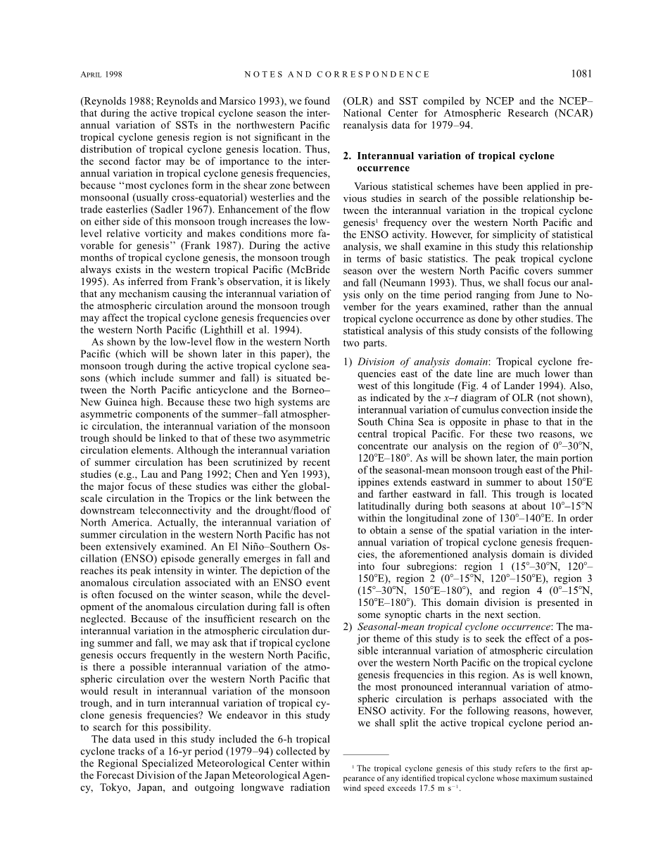 在他最近关于热带气旋成因回顾中,McBride(1995)指出热带气旋生成位置的季节性分布主要由两个因素决定:海平面温度高于26.5℃以及季风槽的位置。研究由NCEP订正(Reynolds 1988; Reynolds和Marsico 1993)海平面温度场,我们发现在热带气旋活跃的季节海平面温度场在西北太平洋热带气旋生成区域的分布上的年际变化不是很显著,因此,季风槽的位置在热带气旋生成频数的年际变化上很重要,因为“绝大多数气旋生成在季风(通常是跨赤道)西风带与东风信风带中的切变区(Sadler 1967)。季风槽任意边气流的增强都增加了低层相对涡度并且使条件更有利于产生热带气旋(Frank 1987)。在热带气旋生成的盛季,季风槽总是出现在热带西太平洋(McBride 1995)。从Frank的观测中推测,很有可能任何机制造成大气环流围绕季风槽的年际变化都可能影响西北太平洋的热带气旋生成频数(Lighthill等人 1994)。