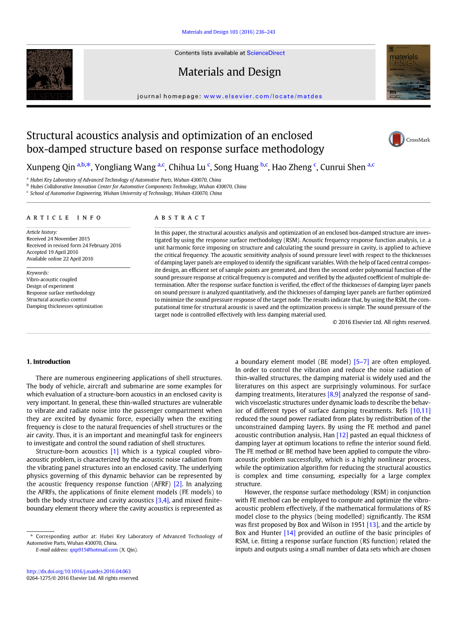 然而,如果RS模型的数学公式明显的接近物理学(被建模),响应面法(RSM)结合FE方法可以被用来有效地计算和优化振动声学问题。RSM是Box和Wilson在1951年首次提出的[13],并且Box和Hunter的文章[14]概述了RSM的基本原理。即用在设计空间中严格选择的少量数据集拟合与输入和输出相关的响应表面函数(RS函数)。由于这些优势,RSM已经应用于许多研究领域,如实验设计(DOE)、和工程结构减振分析[15,16]、火箭发射器的优化设计、失效的离合器拨叉或粘弹性阻尼结构 [17-19]、和频率响应函数计算的结构安全性和可靠性分析,屈曲分析或车辆侧面碰撞耐受性[20-22]等。虽然RSM已成功被应用于减少结构振动(例如参考文献[15,16])和分析声频响应函数(例如参考文献[6]),为控制结构声学的阻尼层的优化,也是一个和振动声学耦合问题,与该问题相关的文献是少量的。例如,参考文献[19]优化了粘弹性阻尼结构的几何参数和材料布局以减少振动,然而它不是耦合的振动声学问题并且没有使用RSM。文献[23,24]研究了声辐射功率与三个设计变量(即底板和阻尼板的厚度,底板的材料参数)之间的函数关系,并且有效地获得了振动板的声辐射水平,然而仅仅研究了结构的外部声学,没有考虑声辐射对结构振动的影响。