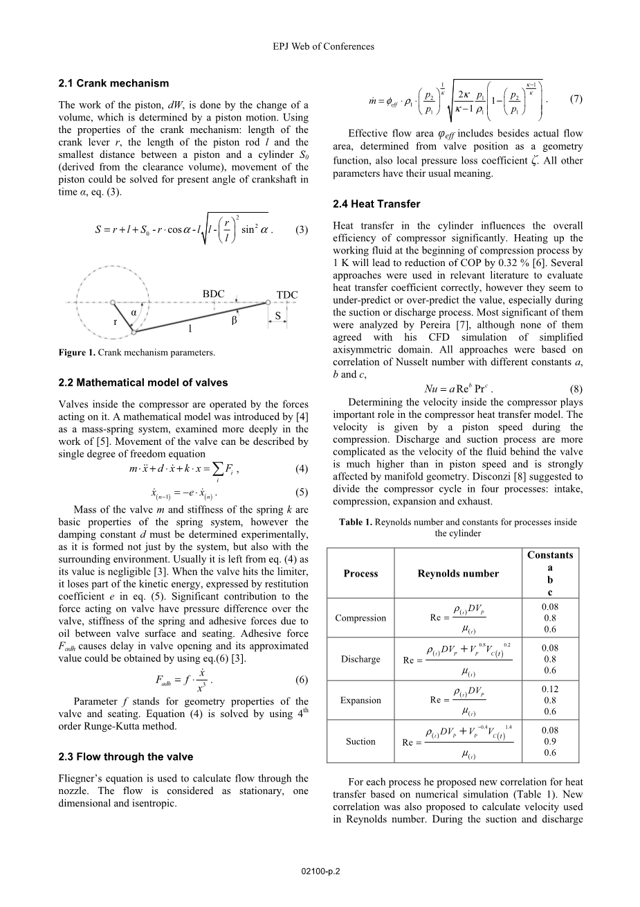 对于压缩机工作的每个过程,他提出了基于数值模拟分析的热量的传递的新的相关性(见表1)。而且他还提出了全新的相关性用来计算雷诺数中使用的速度的值。在气体的吸入和气体的排出的过程中,该速度可以从通过阀门的质量流率来导出: