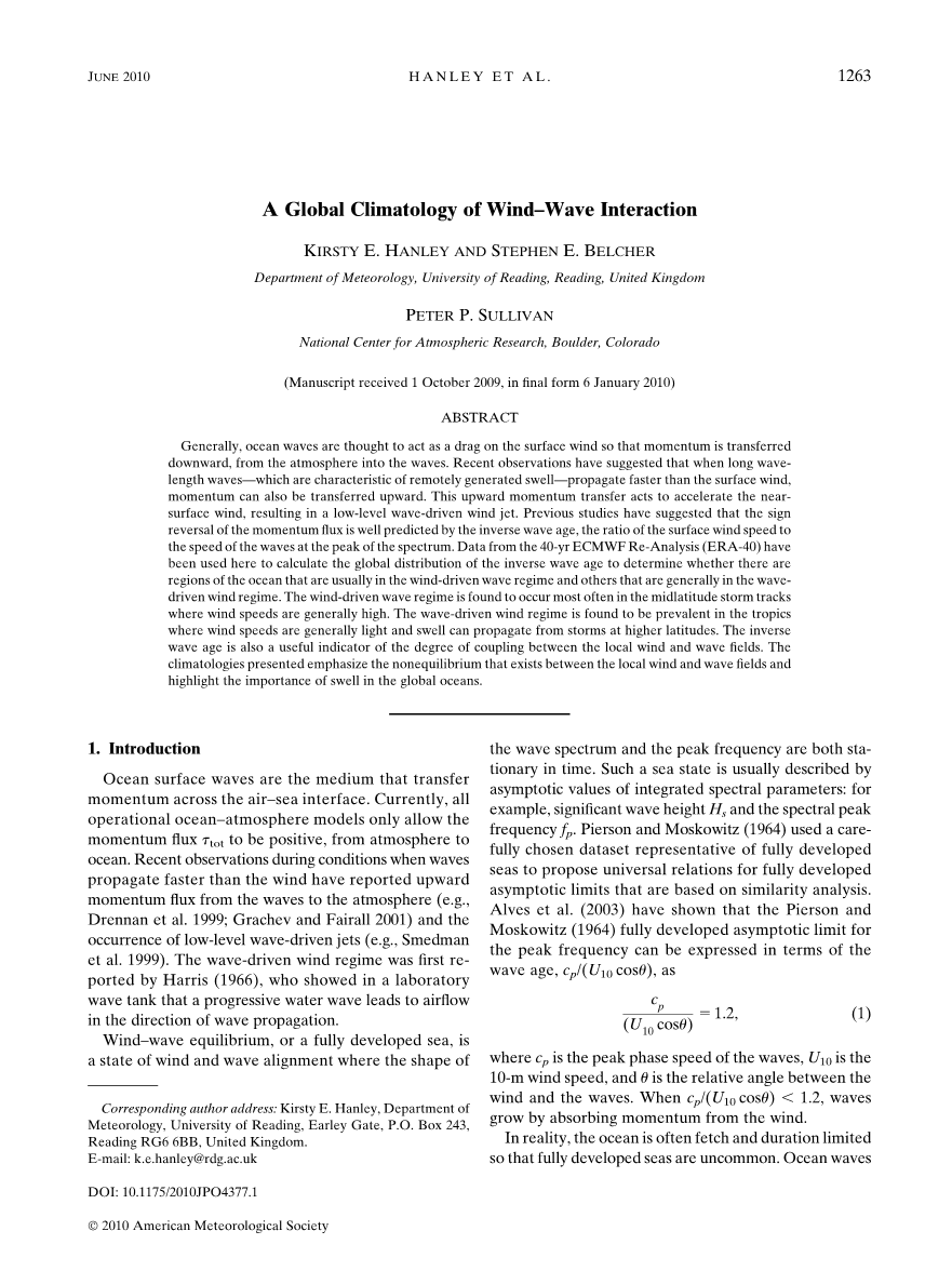 本文的目的是利用欧洲40年中期天气预报中心(ECMWF)的再分析(ERA-40)波数据集,开发一种新的基于风浪相互作用的气候学,即逆波龄诊断气候学。波浪资料的可得性使建立波浪过程和基于风浪相互作用的全球气候学成为可能,而风-波相互作用又解释了风浪和风暴潮。McWilliams和Restrepo(1999)利用风数据将波浪参数化,构建了全球波浪气候学。这种方法假定风浪平衡,因此忽略了远处产生的涌浪。当使用波浪数据时,可以考虑全谱。这里讨论的第一个问题是,局部波场与局部风场耦合到什么程度?在第3节中,ERA-40数据用于研究风暴通过南大洋的影响,计算10 m风速和波相速度峰值的气候。这些气候表明,在许多地区,当地的波浪状态与当地的风力条件无关,并突出了全球海洋中涌浪的重要性。