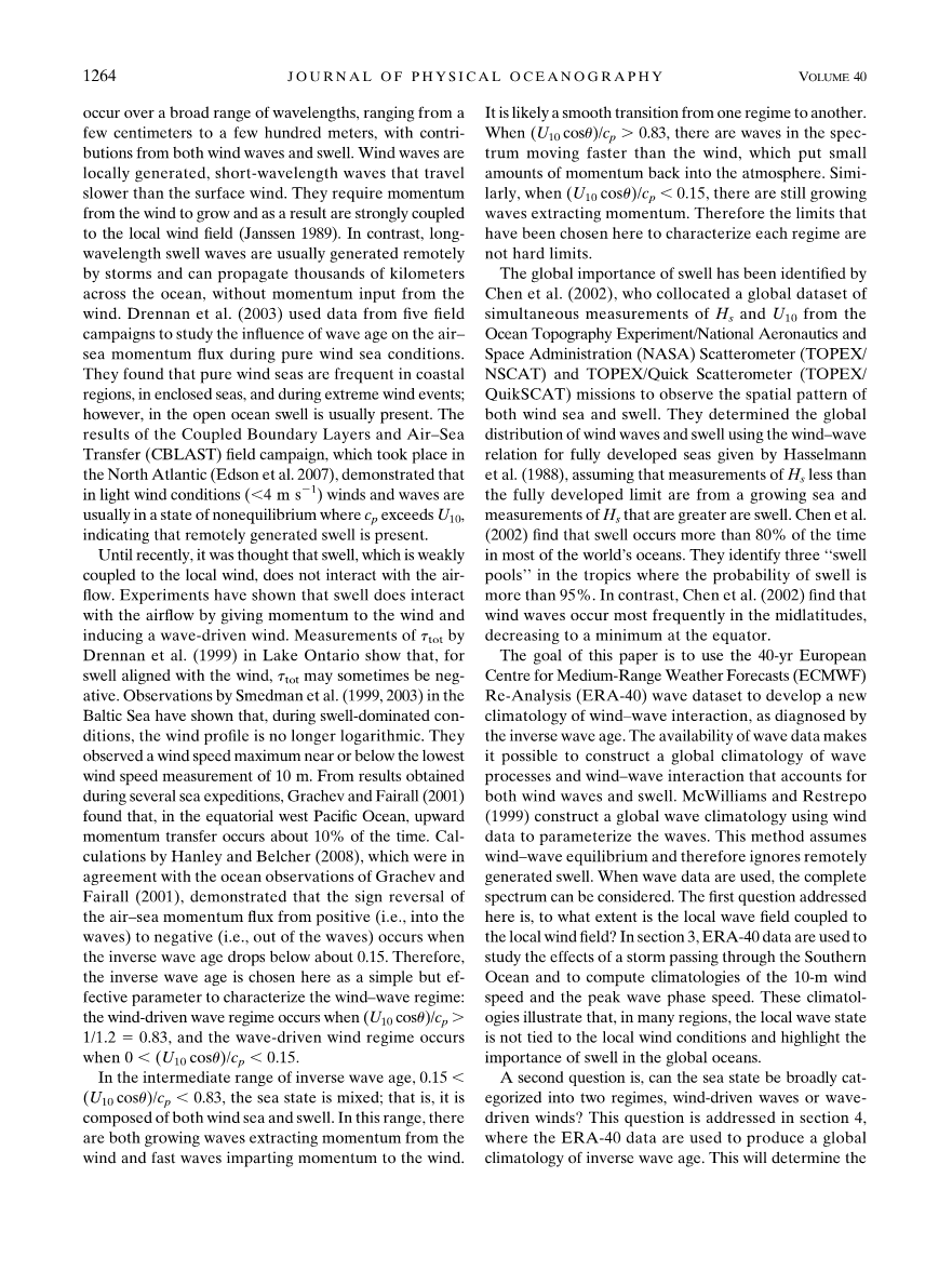 第二个问题是,海洋状态是否可以大致分为两种状态,风驱动浪型还是浪驱动风型?这个问题在第四节中讨论,其中使用ERA-40数据来产生逆波龄的全球气候学。这将决定海洋中通常处于风驱动浪状态的区域和主要处于浪驱动风状态的区域。(U10 costheta;)/cp的气候学提供了每一种气候的空间分布,但没有提供关于每一种气候发生的频率的信息。因此,在第4b节中使用了一种不同的技术来确定这两种状态发生的全局频率。