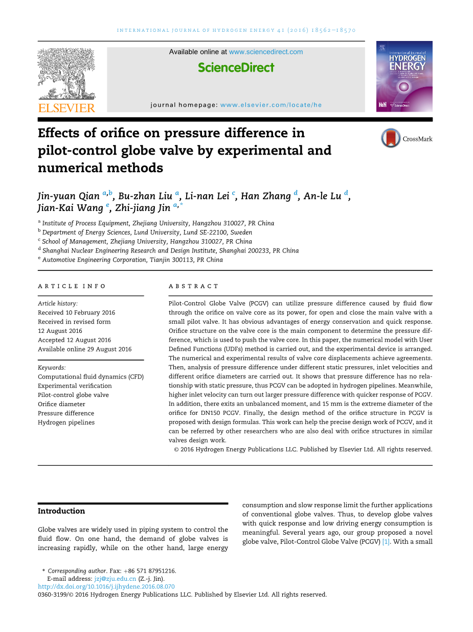 先导控制阀(pcgv)可以利用通过阀芯上的孔的流体流动造成的压力差作为其动力,用小先导阀来开启和关闭主阀。具有节能、响应快等显著优点。阀芯上的节流孔结构是决定阀芯压差的主要元件,用于控制阀芯的压差。在本文中,数值模型结合用户的自定义函数(UDF)方法进行,并且实验也被安排进行了。阀芯的实际位移和实验结果达成一致。然后,分析了不同孔径下的不同静压、入口速度和压力。结果表明,压差与压力没有关系,因此可以采用pcgv氢管道。同时,高流速因为其压差可以更快的响应pcgv。此外,也存在一个不平衡的时刻,15毫米为DN150 pcgv孔的极端直径。最后的,关于pcgv孔的设计方法就被提出了。这项工作可以帮助精确的设计pcgv,并也可以参考其他研究人员处理孔结构相似阀门。