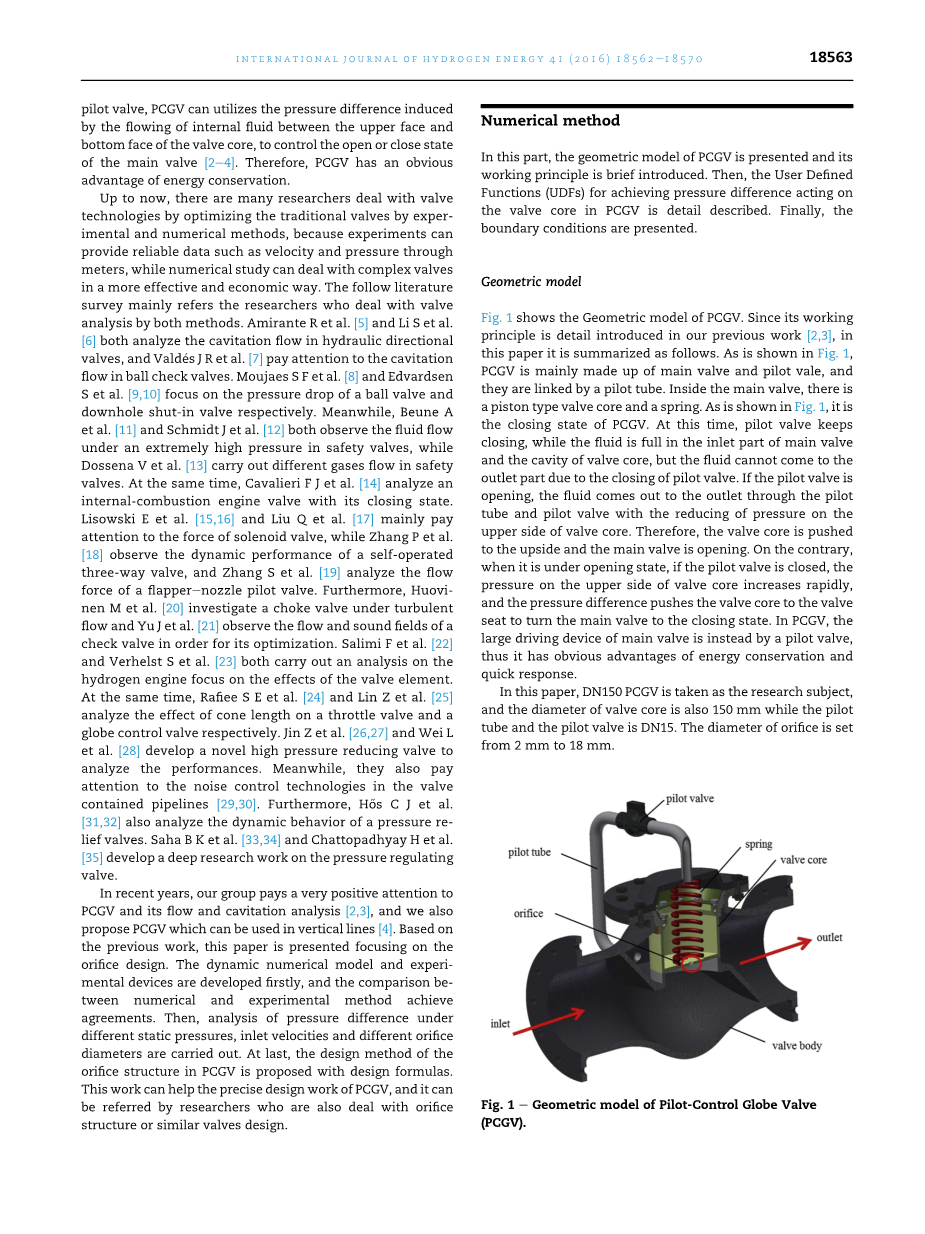 截止阀广泛应用于管道系统来控制流体流动。一方面,截止阀的需求是迅速增加,而另一方面,大能量消费和缓慢反应限制了进一步应用传统的截止阀。因此,开发反应速度快,驱动能耗低的截止阀有意义的。几年前,我们的小组提出了新型的先导控制阀(pcgv)。通过一个小的先导控制阀,pcgv可以利用压力差引起的由阀芯的底面的流体与上端面之间的流动,控制开启或关闭状态主阀的。因此,pcgv具有明显的节能优势。截至目前,有不少科研人员通过实验和数值方法处理阀门,来优化传统阀门的技术,因为实验可以提供可靠的数据,如速度和压力,而数值研究可以以更有效和经济的方式处理复杂的阀门。这是研究人员优化阀门设计的两种有效的方法。Amirante Retal和Li Setal 、ValdesJ等人分析了水力定向中的空化流动阀。注意止回阀流的气蚀球量。Moujaes SFetal和Edvardsen关注球阀的压降和井下关闭阀。与此同时,Beune和Schmidt Jetal既观察流体流动在极高的安全压力下,也在安全中进行不同的气体流动阀门进行研究。Cavalieri FJet al.analyze主要对于具有关闭状态的内燃机气门的作研究。Lisowski和Liu Qetal则把注意力集中在了电磁阀,而Zhang Petal通过观察三通阀动态性能。分析了一个拥有喷嘴挡板的先导阀。更深层次的,Huovinen M研究湍流下的节流阀流动状态。观察一流场内流体的流动和声场止回阀。Salimi和Verhelst S都进行氢发动机聚焦阀元件影响的分析。同时,rafiee SE和LinZ分析了球形控制阀锥长对节流阀的影响。Jin Z和Wei L研制一种新型高压减压阀性。同时,他们也关注管道阀门的噪声控制技术。