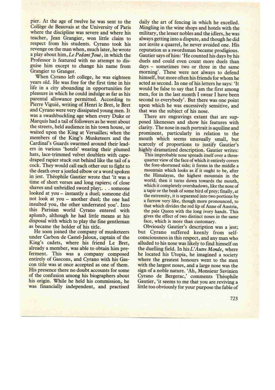 戈蒂埃提到西拉诺和演员蒙夫勒里在波哥大饭店的争吵。他引用了西拉诺对这位演员的一段很长的演讲,演讲的内容是关于他体型巨大,不适合登台表演。后来当蒙夫勒里旧照暴露时,西拉诺站在观众席上要求他退休。“如果他不这样做,”剑客说,“他也会认为自己已经死了。”蒙特·尤里知道西拉诺的长剑,立即把奥贝耶克带了回来,至少一个月没有露面,直到他被允许重新开始他的职业生涯。在他看来,西拉诺并不是唯一一个这样认为的人,这一点在莫里埃的笔下得到了证实。在莫里埃的早期作品中,蒙蒂尤里被嘲笑为一头河马,是一位玛尔人。然而,后来他写了一本小册子,支持马扎林反对弗朗德。他的第一部戏剧《学究焦耳》是一部喜剧。但是他的第二部,也是最后一部,却是一出悲剧——《阿格里宾庄园》,在诗里,在经典的《亚历山德拉》里,有许多圣贤被认为并不比《科尼耶庄园》逊色。这些戏剧不是作品,事实上在他去世多年后,他的手稿才流传下来,并为许多人所喜爱。