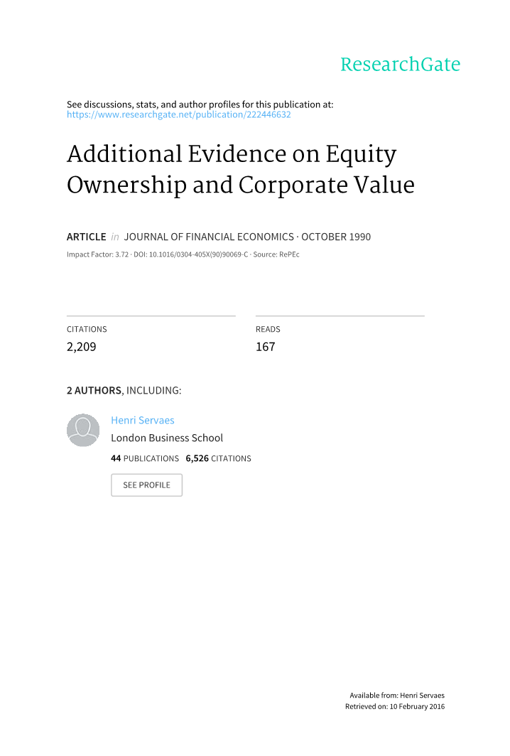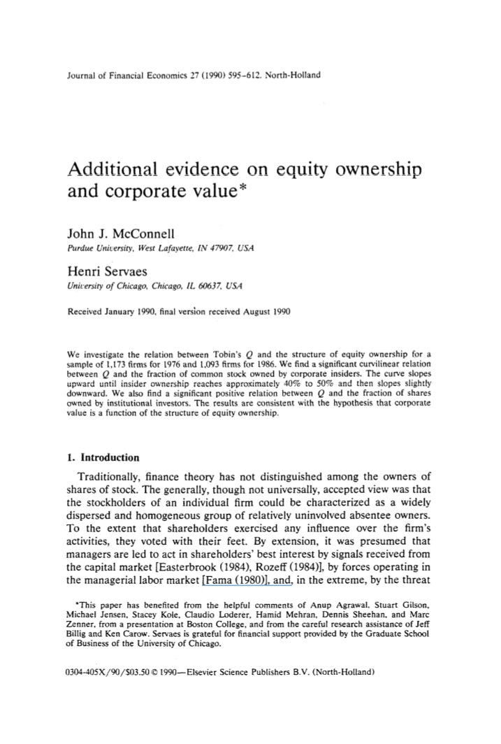 在本文中,给出了关于股权分配和公司价值之间关系的进一步证据。具体来说,本文研究托宾Q与股权之间的横截面关系,采用1976年的1,173家公司样本和1986年的1,093家公司的样本数据。所有公司选自纽约证券交易所或美国证券交易所(AMEX)。对于这两年的样本,本文研究得出了一个重要的结论:托宾Q与公司所拥有股份比例之间存在曲线关系。随着股权的变动,托宾Q首先增加,当经理和董事会成员手中的股份减少时减少。当向下的曲线超出了拐点时,曲线变得不陡峭。本文还发现托宾Q和机构投资者持有的股份比例之间存在显着的正相关关系。同时托宾Q与股票大股东拥有的股权比例存在之间没有存在显著相关性。