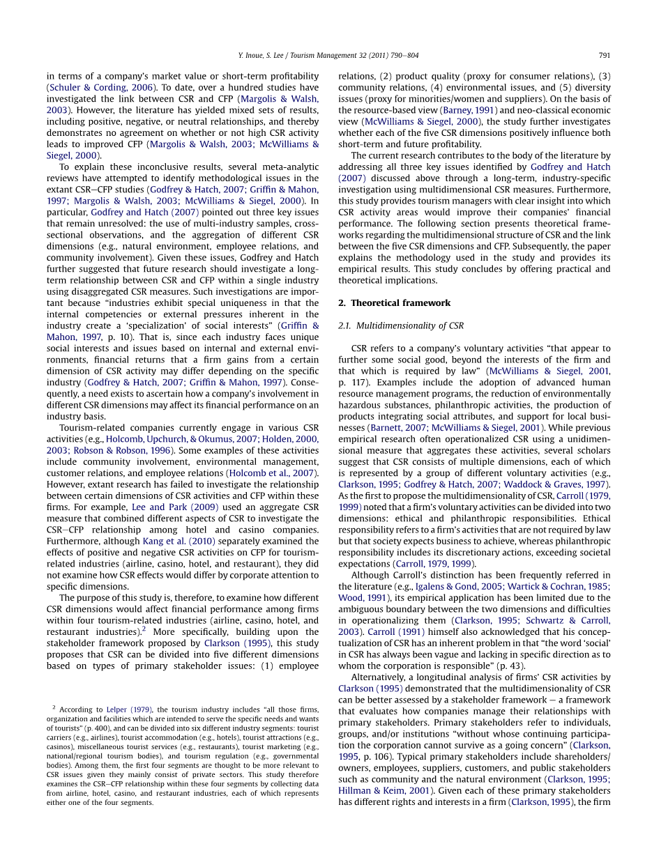 目前的研究通过使用多层面的企业社会责任措施,通过一项长期的、针对具体行业的调查,解决了由Godfrey和Hatch(2007)确定的所有三个关键问题,从而为文献正文做出了贡献。此外,这项研究为旅游经理提供了明确的洞察力,哪些企业社会责任活动领域将改善他们的公司的财务业绩。以下部分介绍了企业社会责任的多维结构的理论框架,以及企业社会责任的五个维度与企业社会责任之间的联系。随后,本文对本文所采用的研究方法进行了说明,并给出了实证结果。本研究的结论是提供了实践和理论上的启示。