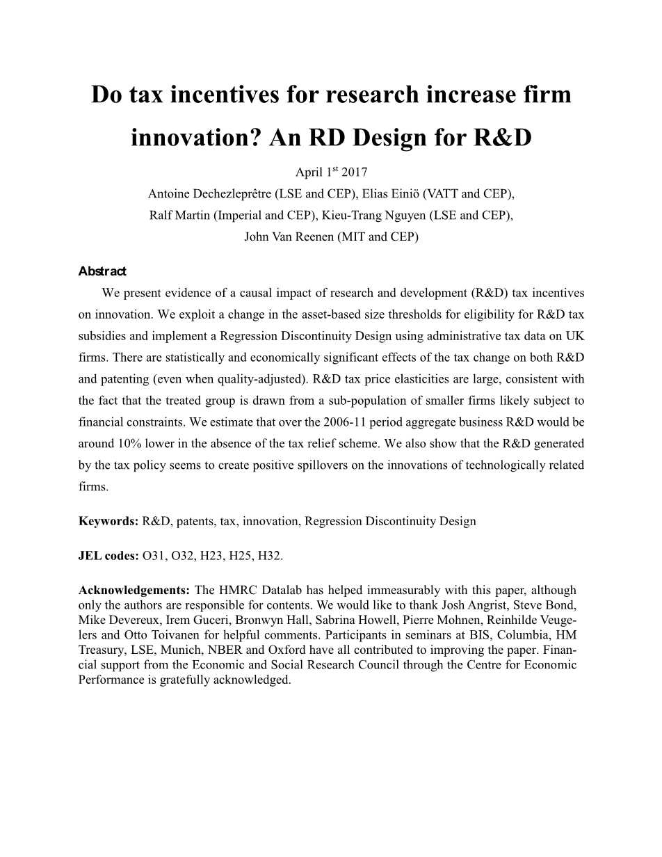 但研发税收优惠措施真的有效吗?现有文献存在着一些严重的不足,本文试图加以解决。首先,研究人员主要关注税收对研发的影响,而政策的重点是尝试和刺激创新。税收激励可以增加观察到的研发,而不会对创新产生太大影响,例如,如果企业将现有活动重新标记为研发,以利用税收抵免,或只扩大非常低质量的研发项目。我们通过分析研发税收激励措施对研发支出以及专利活动(以及其他企业绩效指标,如生产力和规模)的影响来解决这个问题。我们还通过各种常用的专利价值衡量标准来考察这些额外创新的质量。