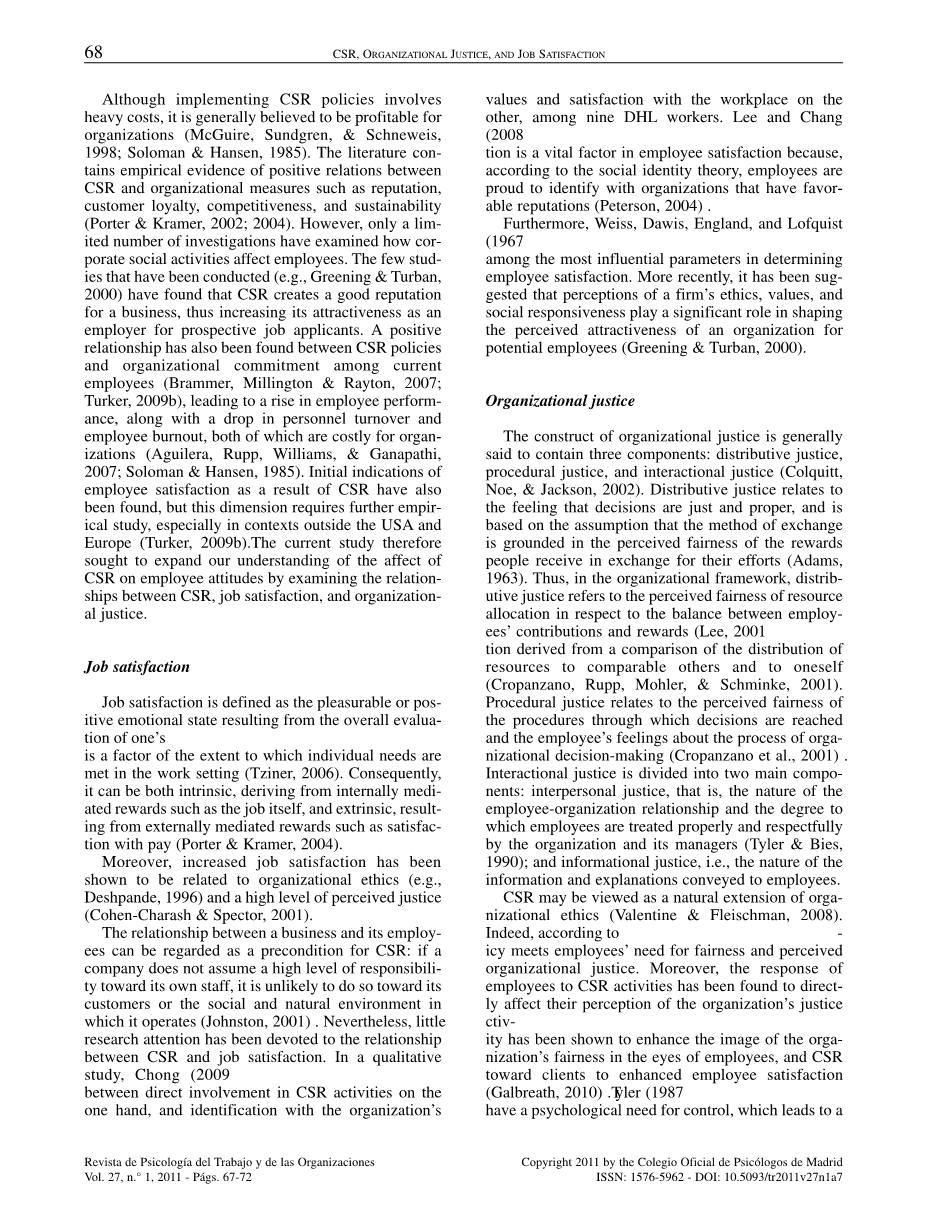 员工公平感知理论(Cropanzano 等人,2001)认为,员工对组织公平的评价是根据组织表现出的公平程度。根据社会认同理论(Tajfel amp;特纳,1986),公司作为一个有社会责任感的社会成员会努力去形成工一个积极的自我形象,成为组织中的骄傲,认为这可能影响对工作的积极态度,如工作满意度(Maignan amp;法瑞尔,2001;彼得森,2004)。此外,员工认为他们的组织是道德的、对他们是公平的(Eici amp; Alpkan,2009),并有义务为他们提供理想的工作作为他们非正式职业合同的一部分(Valentine amp; Fleischman,2008)。事实上,工作环境的感知对员工的组织承诺程度和工作满意度有正向影响(Chen,Zhang,Leung,amp; Zhou,2010)。