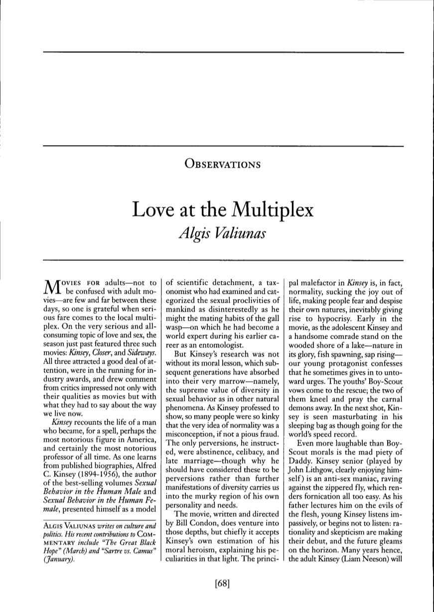 给成年人看的电影——不要和成人电影混为一谈——在这段时间里很少,因此,当地的复式影院有了严肃的票价时,人们就会心存感激。关于爱情和性这个非常严肃而又充满激情的话题,刚刚过去的这一季有三部这样的电影:《金赛性学教授》、《偷心》和《杯酒人生》。这三部作品都吸引了很多人的注意,他们都在角逐行业奖项,评论家们的评论使它们让人印象深刻,不仅因为它们作为电影的品质,还因为它们对我们现在的生活方式所不得不说些什么的特性。