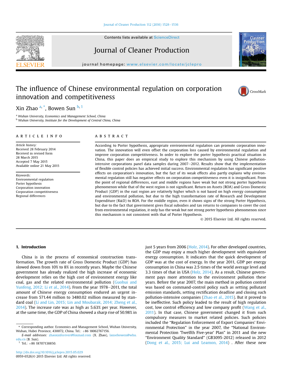 摘要:根据波特假设,适当的环境监管可以促进企业创新。这项创新甚至可以抵消环境监管造成的公司损失,提高企业竞争力。为了探讨波特假设在中国的实践情况,本文采用实证研究方法,利用中国污染密集型企业面板数据样本(2007年至2012年)来探索这一机制。结果表明,灵活控制政策的实施取得了初步成效。环境监管对企业的创新有着显著的积极影响,但其弱势影响的事实也在一定程度上解释了为什么环境监管仍然对企业竞争力会产生负面影响,即使这种影响很小。从区域差异来看,东部和中部地区存在较强的波特假设现象,而西部地区则不显著。东部地区的资产回报率(ROA)和国内生产总值(GDP)相对较高,不是基于高能耗和环境污染,而是由于研发支出(R&D)对ROA的高转化率。对于中部地区,即使它显示出强烈的波特假设的迹象,但由于政府给予公司财政补贴和纳税申报以支付环境监管的成本,因此它只有不是很强的波特假设现象。这种机制与波特假设的机制不一致。