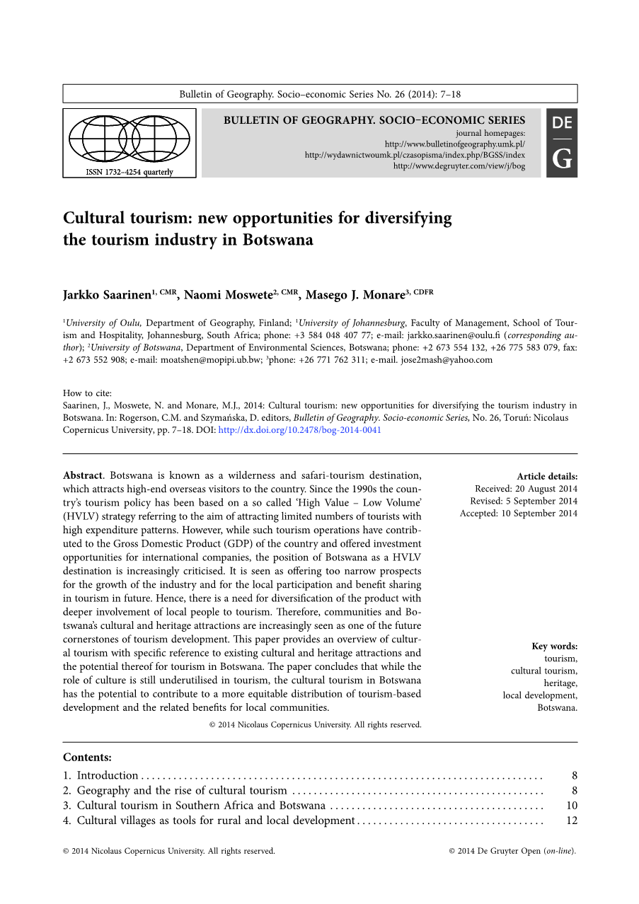 关键词:旅游 文化旅游 遗产 地方发展 博茨瓦纳