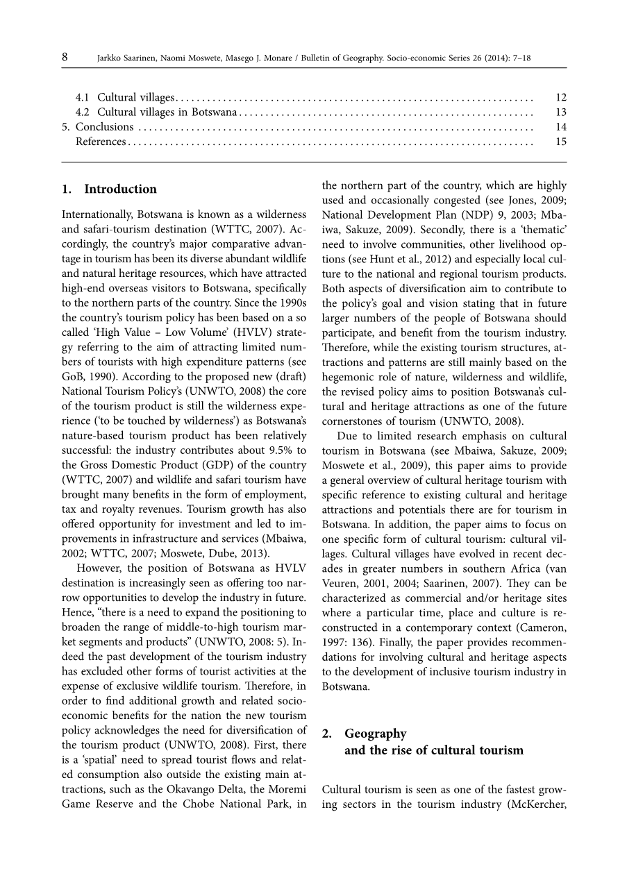 在国际上,博茨瓦纳被称为荒野和野生动物园旅游目的地(WTTC,2007)。因此,该国在旅游方面的主要比较优势是其丰富多样的野生动物和自然遗产资源,吸引了博茨瓦纳的高端海外游客,特别是该国北部地区。自20世纪90年代以来,该国的旅游政策基于所谓的“高价值 - 低产量”(HVLV)战略,其目的是吸引有限数量的高消费模式的游客(见GoB,1990)。根据拟议的新(草案)国家旅游政策(UNWTO,2008),旅游产品的核心仍然是荒野经验(被荒野所感动),因为博茨瓦纳的自然旅游产品相对成功:该行业对该国的国内生产总值(GDP)贡献了约9.5%(WTTC,2007),野生动植物和野生动物园旅游业以就业,税收和版税收入的形式带来了许多好处。旅游业的增长也为投资提供了机会,并促进了基础设施和服务的改善(Mbaiwa,2002; WTTC,2007; Moswete,Dube,2013)。然而,博茨瓦纳作为HVLV目的地的地位越来越被视为未来发展该行业的机会过于狭窄。因此,“有必要扩大定位,以扩大中高端旅游市场和产品的范围”(UNWTO,2008:5)。事实上,旅游业的过去发展已经排除了其他形式的旅游活动,而牺牲了独家野生动物旅游业。因此,为了找到国家的额外增长和相关的社会经济效益,新的旅游政策承认旅游产品多样化的必要性(UNWTO,2008)。首先,在现有的主要影响之外,如奥卡万戈三角洲,莫雷米野生动物保护区和乔贝国家公园,有一个“空间”需求来传播旅游流量和相关消费。该国北部地区使用频繁且偶尔拥挤(参见Jones,2009;国家发展计划(NDP)9,2003; Mba- iwa,Sakuze,2009)。其次,有一个“主题”需要涉及社区,其他生计选择(参见Hunt等,2012),特别是当地文化对国家和地区旅游产品的影响。多样化的两个方面都旨在促进政策的目标和愿景,即未来博茨瓦纳的更多人应该参与并从旅游业中受益。因此,虽然现有的旅游结构,吸引力和模式仍然主要基于自然,荒野和野生动物的霸权角色,但修订后的政策旨在将博茨瓦纳的文化和遗产景点定位为未来旅游业的基石之一( UNWTO,2008)。由于博茨瓦纳对文化旅游的研究重点有限(见Mbaiwa,Sakuze,2009; Moswete等,2009),本文旨在提供文化遗产旅游的概述,具体参考现有的文化和遗产景点和潜力。是博茨瓦纳的旅游。此外,本文旨在关注一种特定形式的文化旅游:文化村庄。近年来,南部非洲的文化村已经发生了更多的变化(van Veuren,2001,2004; Saarinen,2007)。它们可以被描述为商业和/或遗产地,其中特定的时间,地点和文化在当代背景下被重建(Cameron,1997:136)。最后,本文提供了有关文化和遗产方面的参与,以促进博茨瓦纳包容性旅游业的发展。