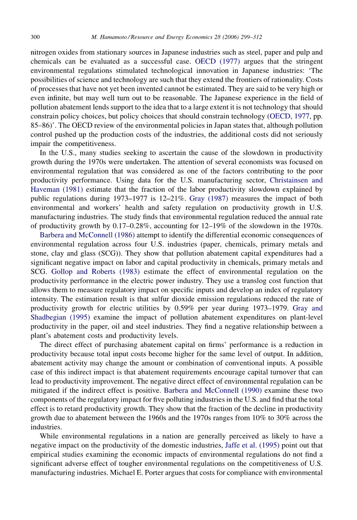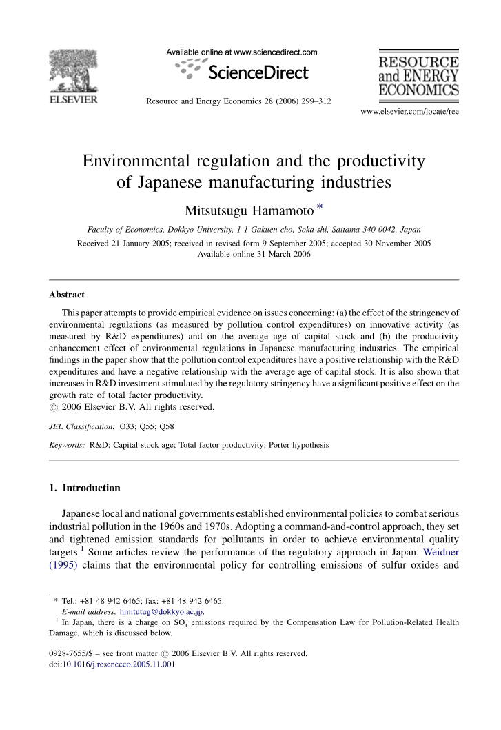 虽然一般情况下认为一个国家的环境法规可能会对国内产业的生产力产生负面影响,但Jaffe(1995)等人指出,检验环境法规的经济影响的实证研究并未发现更严格的环境法规对美国制造业竞争力的重大不利影响。Michael E. Porter认为,遵守环境法规的成本将被法规鼓励的技术创新(创新抵消)所导致的成本降低所抵消(Porter和van der Linde,1995)。这种说法被称为“波特假设”。波特认为日本控制污染的经验是一个典型的例子,说明他严格的环境法规提高了工业生产率的论点。他指出,“德国和日本都有严格的规定,两国继续超过美国的国民生产总值增长率和生产率增长率(波特,1991年,第96页)”。尽管日本国家和地方政府在20世纪70年代制定的环境法规比20世纪60年代更严格,但1965年至1973年期间和1973年至1978年期间日本制造业的全要素生产率(TFP)平均增长率分别为0.91%和1.64%(Norsworthy和Malmquist,1983)。这表明严格的环境规制不一定会导致日本制造业生产率的下降。