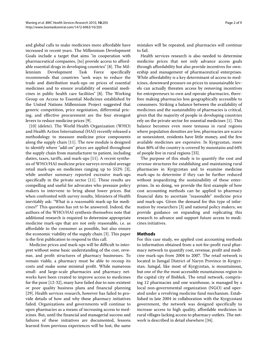方法:我们通过利用从吉尔吉斯斯坦山区农村非营利性药房网络获得的存货和财务信息中的成本核算方法,量化药店建立和维护期间(2004年10月至2007年12月)的成本、收入、利润和药品加价。