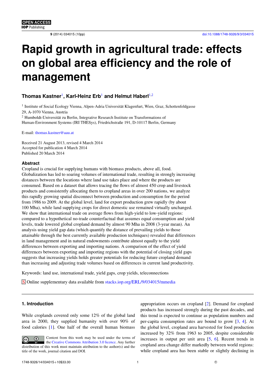 摘要:农田对人类提供生物质产品至关重要,尤其是食品。全球化导致国际贸易量飙升,导致土地使用地点与产品消费地点之间的距离大幅增加。基于一个数据集,该数据集可以追踪近450种作物和畜产品的流量并将其持续分配到200多个国家的农田地区,我们分析了1986年至2009年期间生产和消费之间快速增长的空间脱节。水平,出口生产土地增长迅速(约100 Mha),而供直接国内使用的作物的土地基本保持不变。我们表明,国际贸易平均从高收益地区流向低收益地区:与假设消费和收益水平相等的假设无贸易反事实相比,2008年全球耕地需求减少了近90万公顷(3年平均值)。利用产量缺口数据(量化当前产量与通过现有最佳生产技术获得的产量之间的距离)进行的分析表明,土地管理和自然禀赋的差异对出口国和进口国之间的产量差异几乎同等贡献。对出口和进口地区产量差异的影响与收益率差距可能性的比较表明,增加产量对于减少未来耕地需求的潜力大于根据当前土地生产率的差异增加和调整贸易量。