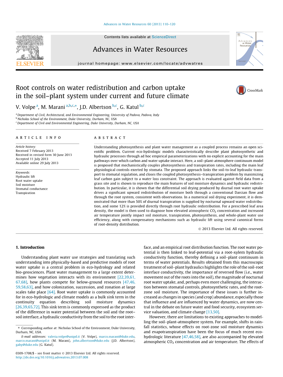将植物水管理和光合作用理解为一个耦合过程仍然是一个开放的科学问题。当前的生态水文模型通过特殊的经验参数化特征描述了植物的光合作用和水力过程,但没有明确说明碳和水吸收相互作用的主要途径。本文提出了一个土壤-植物-大气连续模型,从机理上耦合光合作用和蒸腾速率,包括由气孔施加的主要叶片生理控制。将土壤到叶片的水力运输与气孔调节联系起来,并通过最大化受到水分损失限制的叶片碳增加,来关闭耦合的光合作用-蒸腾问题。根据来自草地的田间数据进行评估,显示出重现土壤湿度动态和水力再分配的主要特征。特别是,研究表明,将白天根系吸水产生的差异性土壤干燥通过传统达西流和根系驱动水分的显著向上再分配后,得到的结果与观察结果一致。在数值土壤干燥试验中,证明了50%以上的日蒸腾量是由夜间向上的水分补给的,其中大约12%是通过根系水力再分配直接提供的。对于规定的叶面积密度,该模型用于诊断大气CO2浓度升高和气温升高如何共同影响土壤水分、蒸腾作用、光合作用和整个植物水分利用效率,以及补偿机制,如采用几种典型形式的水力提升根系密度分布。