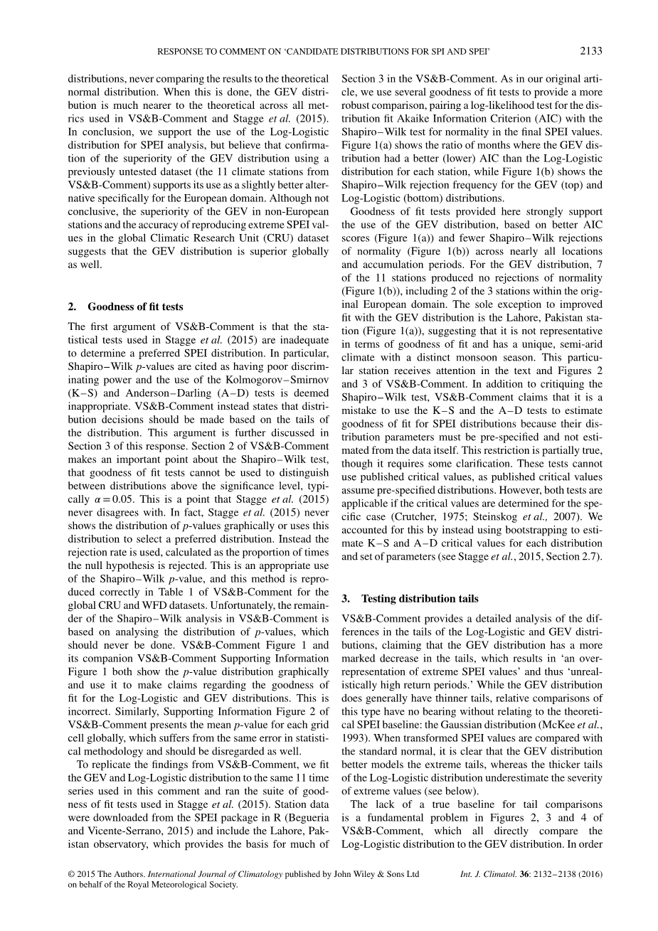 “vsamp;b的评论”的第一个论点是Stagge等人使用的统计测试(2015)不足以确定首选的SPEI分布。尤其是,夏皮罗-威尔克p值被认为具有较差的辨别力,使用柯尔莫戈洛夫-斯米尔诺夫(K-S)和安德森-达林(A-D)测试被认为是不适当的。 “vsamp;b的评论”中表示,分布的决定性应基于分布的尾部。这一论点将在本回复的第3节中进一步讨论。“vsamp;b的评论”中第2部分对W检验(shapiro-wilk检验)提出了一个重要的观点,即拟合优度检验不能用于区分显著性水平以上的分布,通常为0.05。这一点是Stagge等人(2015)决不反对的观点。事实上,Stagge等人(2015)从不以图表的方式显示p值的分布,也不使用该分布来选择首选分布。而是使用拒绝率,按拒绝无效假设的次数的比例计算。这是对W检验中的p值的适当使用,该方法对 “vsamp;b的评论”中的表1---全球CRU和WFD数据集,进行了准确的再现。不幸的是,在“vsamp;b的评论”中的W检验分析的其余部分是基于对p值分布的分析,这是不应该做的。“vsamp;b的评论”中图1及其配套的“vsamp;b的评论”中支持图1的信息描述都以图形方式显示了p值分布,并使用它对对数逻辑和GEV分布的拟合优度进行了声明。这是不正确的。同样,“vsamp;b的评论”中的支持图2的信息描述显示了全球每个网格单元的平均p值,这在统计方法上存在相同的错误,也应予以忽略。