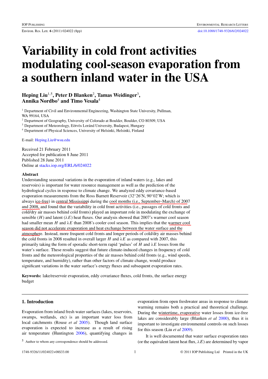 Heping Liu1,5, Peter D Blanken2, Tamas Weidinger3, AnnikaNordbo4, Timo Vesala