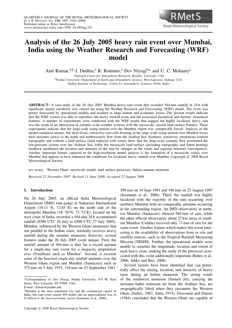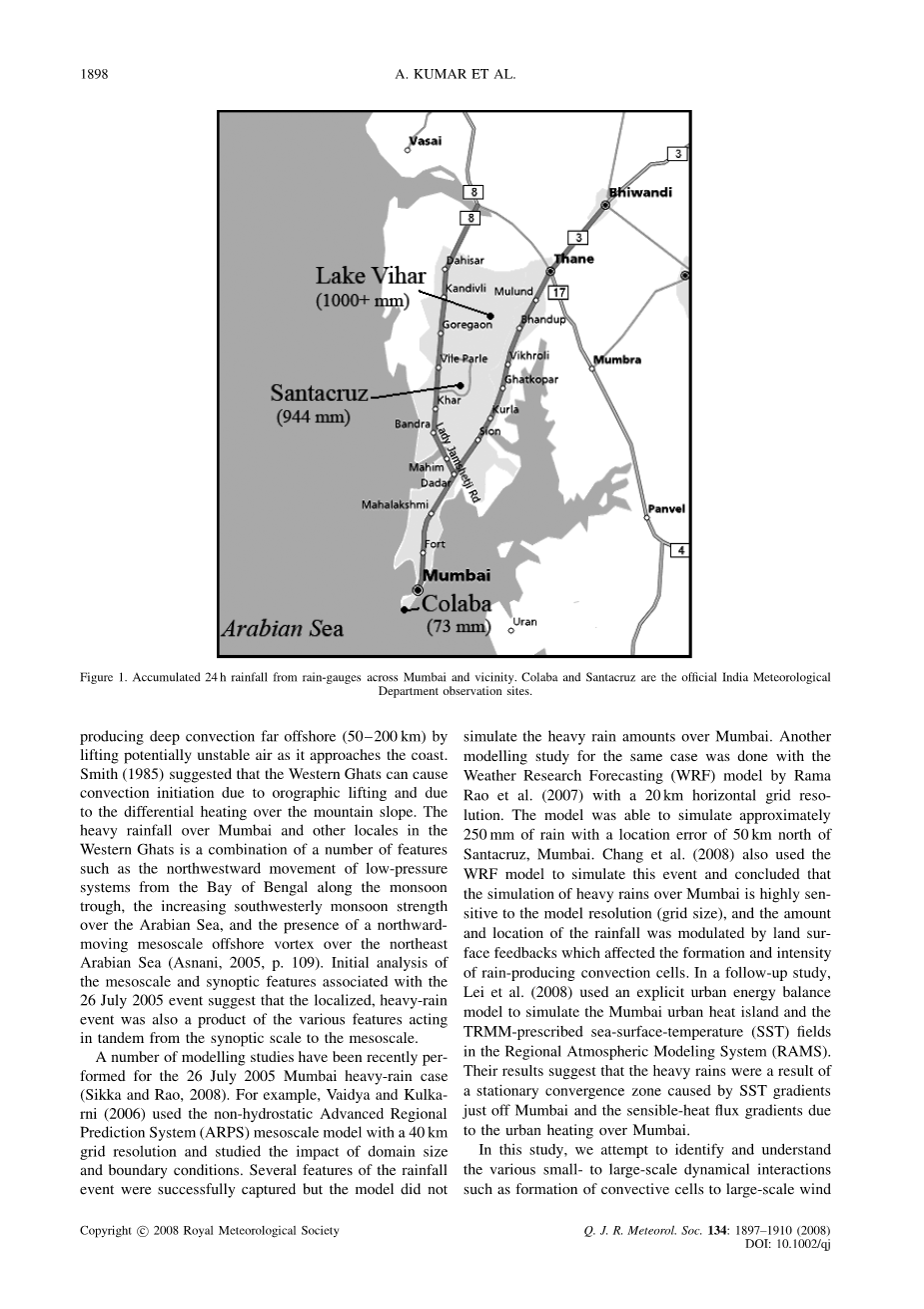 2005年7月26日,一个官方印度气象局(IMD)在大都市孟买北部印度的西海岸的圣克鲁斯国际机场(19.11N,72.85E)(18.56N,72.51E),录得24小时944毫米累积雨量(7月26日0300 UTC至2005年7月27日0300 UTC)。由与印度海岸平行的西高止山脉阻隔,孟买通常在夏季季风季节常遭受暴雨。然而,有几个特点使得2005年7月26日的事件是独一无二的。首先,944毫米降雨量是迄今为止对一个例如孟买的超大城市(人口超过1000万),单日降雨事件的记录量。其次,一些超过1981年9月23日的399mm最重的单日降雨量在西高止山脉地区和1975年7月孟买(圣克鲁斯)318毫米,如1991年6月5日375毫米和1997年8月23日346毫米(Jenamani等人,2006)。三,雨区主要发生在孟买北部,且与南部无语去比较,雨量就明显表现为当地化效应。在孟买北部(圣克鲁斯)的IMD天文台显示雨量944毫米,而其他官方天文台在孟买南部(戈拉巴)约27公里只获得73毫米降水在本次过程中。使得这个事件有趣的另一个特点是观测的有效性,从现场和卫星资源来看,如热带降雨测量使命(TRMM)。此外,运营模式无法模拟这种豪雨的大小,位置和强度,使得与此事件还重要相关过程的研究(Bohra等,2006;西卡和Rao,2008)。印度的季风期间有几个已经可能潜在地影响暴雨发生的时间,地点,和暴雨强度的因素已被确定。西南季风(索马里急流)的强风,从阿拉伯海携带充满水分的季风气候,当他们遇到的西高止山脉(萨哈,1974年Sarker,1967年)可能会被阻断。 Grossman和durran(1984)得出结论,西高止山脉能使远海(50-200km)通过在接近海岸解除潜在的不稳定的空气产生深刻的对流。史密斯(1985)认为,西高止山脉可引起对流萌生,由于地形提升和过度山坡差加热。强降雨在孟买和其他语言环境中的西高止山脉是多项因素共同影响造成的,如来自孟加拉湾沿季风槽,越来越西南季风强度在阿拉伯海低压系统的西北运动,和存在在东北阿拉伯海一个向北运动的中尺度近海涡旋的共同影响下(Asnani,2005,第109页)。并与2005年7月26日事件相关的天气特点的初步分析表明,本地化豪雨事件也是串联行动从天气尺度到中尺度的各种因素的产物。最近已经在2005年7月26日孟买豪雨方面进行了大量模拟研究。例如,维迪和库卡尼(2006)所使用的非静力高级区域预报系统(ARPS)中尺度模式与一条40公里的网格分辨率和研究领域规模和边界条件的影响。降雨事件的几个特点被成功获得,但该模型没有在孟买模拟降水量。对同一案件的另一个模型研究是由拉玛饶等人的天气研究预报(WRF)模型完成的,用20公里的水平网格分辨率。该模型是能够模拟出孟买50公里以北的圣克鲁斯的误差大约为250毫米的降水。 Chang等人也使用WRF模式来模拟此事件,并得出结论认为,暴雨在孟买的模拟关键是在模型分辨率(网格的大小),且降雨量和位置高度敏感于由影响地表反馈调制形成和降雨产生的对流单体的力度。在后续研究中,雷等人(2008)用一个明确的城市能源平衡模型来模拟孟买城市热岛和中区域大气模拟系统(RAMS)的TRMM-规定的海表面温度(SST)的视场网络。他们的研究结果表明,大雨造成的SST梯度固定的交汇地带,就在孟买和显热通量梯度的结果,由于城市热过孟买。在这项研究中,我们试图识别和理解各种小型到大型的动态交互,如形成对流单体对大型风,下面的第2节,我们总结了此事件的雨量观测;第3节介绍了WRF模式设置和它的特性;第4部分讨论了模式验证;第5描述模型敏感性测试。结论在第6节介绍。