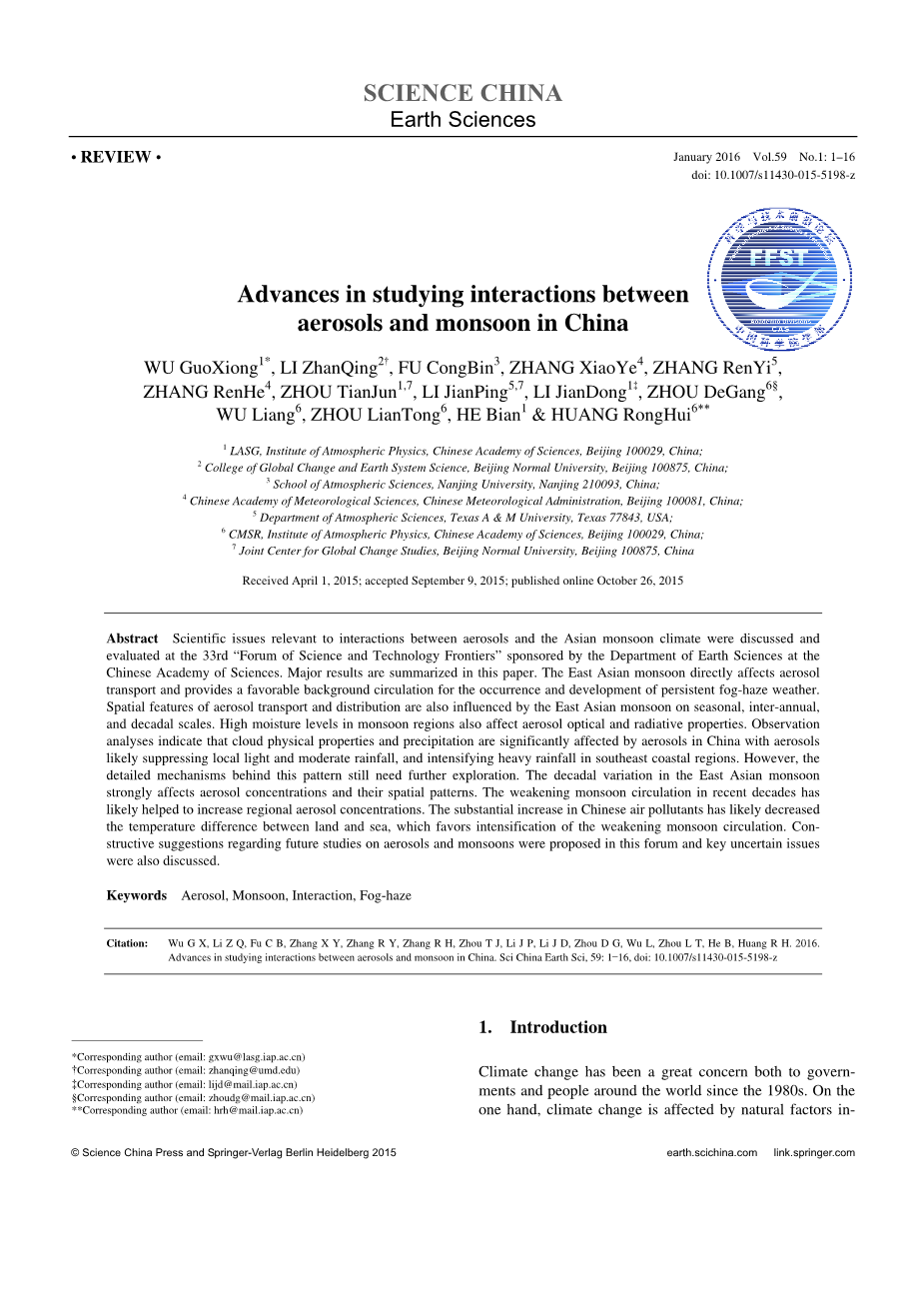 许多研究已经解决了气溶胶对东亚季风气候的影响,特别是在南亚(例如,刘和基姆,2006;bollasina et al.,2011)。然而,由于影响季风气候因素的复杂性,在长期模拟气候变化对中国的气候模式仍有许多困难的。目前的研究主要集中在对测量影响的定量分析和基于气候模型的数值模拟(Menon et al.,2002;Li L J et al.,2007;牛et al.,2010;Li H M et al.,2010;宋等人,2014),但尚未得出明确的结论。以量化的气溶胶对中国的天气和气候的影响是一个巨大的挑战。这项研究简要回顾了国内外有关的研究,从天气和气候的两个方面,指出了一些被广泛接受的结果。